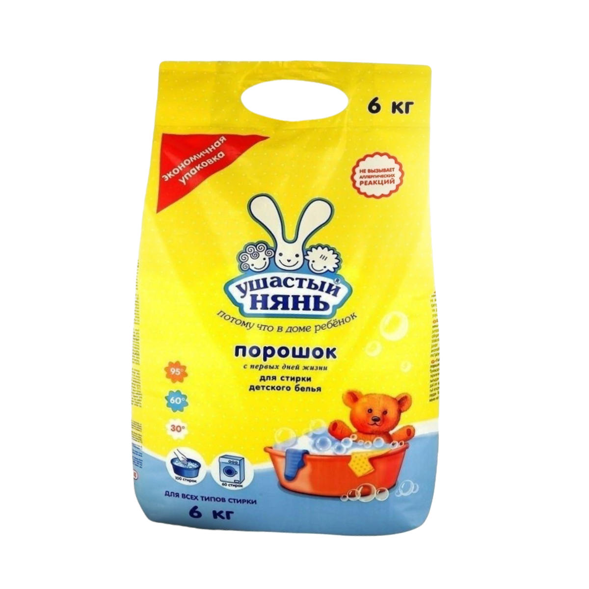 Порошок стиральный универсальный Ушастый Нянь детский 6 кг. Назначение: Стиральный порошок автомат детский гипоалергенный Ушастый Нянь с первых дней жизни. Бесфосфатное экологичное средство для стирки одежды и белья детей и людей с очень чувствительной кожей детский стиральный порошок Ушастый Нянь с первых дней жизни. Способ применения: Предназначено для стирки, отбеливания и замачивания детской одежды, в том числе пеленок и белья детей первого года жизни. Для всех видов тканей, кроме шерсти и шелка, в стиральных машинах любого типа и ручной стирки. С любовью и заботой мы предлагаем вам этот детский стиральный порошок. Инновационная формула, содержащая растительные моющие вещества и экокомпоненты, как волшебный вихрь удаляет пятна и обеспечивает суперчистоту по результату и мягкость по действию. Новая формула на основе растительных моющих веществ и экокомпонентов глубоко проникает в волокна тканей, помогая удалить самые стойкие пятна, и обеспечивает абсолютное выполаскивание порошка. Специальные непылящие гранулы безопасны при использовании. Сочетание натуральных компонентов и мягкого отбеливателя позволяет сохранять структуру и прочность ткани. Ионизировано серебром - идеальной природной защитой от бактерий. Новая формула обогащает цвет изделий, сохраняя их первоначальный вид, а белому придает ослепительную белизну. Полное отсутствие фосфатов обеспечивает безопасность порошка для детской и чувствительной кожи и сохраняет экобаланс природы, предотвращая водоемы от бурного цветения водорослей, поглощающих кислород. Мы стараемся быть в гармонии с окружающим миром, сохраняя здоровье вашей семьи! Без фосфатов, без красителей, без ПАВ нефтехимического производства, без продуктов животного происхождения. Содержит комплексную систему защиты стиральной машины от накипи. Для стирки детских изделий из хлопчатобумажных, льняных, синтетических тканей, а также тканей из смешанных волокон, как вручную, так и в автоматических стиральных машинах и машинах активаторного типа. Подходит для белья и одежды детей любого возраста, в том числе новорожденных. Эффективно справляется с пятнами от молока, фруктовых и овощных пюре, соков, каш, яиц, а также продуктов жизнедеятельности малышей. Начинает действовать уже в процессе замачивания и удаляет загрязнения в воде низкой температуры. Легко выполаскивается из ткани, что исключает попадание на кожу ребенка моющих средств. Не вызывает аллергических реакций. Компоненты порошка защищают ткань во время стирки, сохраняют яркие цвета детских вещей, поэтому они долгое время будут выглядеть как новые. Меры предосторожности: Попадание стирального порошка внутрь организма может привести к тяжелым отравлениям, поэтому необходимо соблюдать рекомендации производителя. Не нужно трогать порошок руками, при засыпании в отсек не вдыхать, после использования плотно закрывать вскрытую упаковку (лучше пересыпать в специальный контейнер). Состав: 15-30%: фосфаты; 5-15%: кислородсодержащий отбеливатель, анионные ПАВ; менее 5%: пеногаситель, неиногенные ПАВ; энзимы, оптические отбеливатели, отдушка. Условия хранения: Рекомендуется хранить порошок при температуре +15-25°С при относительной влажности до 60%. Необходимо располагать бытовую химию подальше от пищевых продуктов, в недоступном для детей и д
