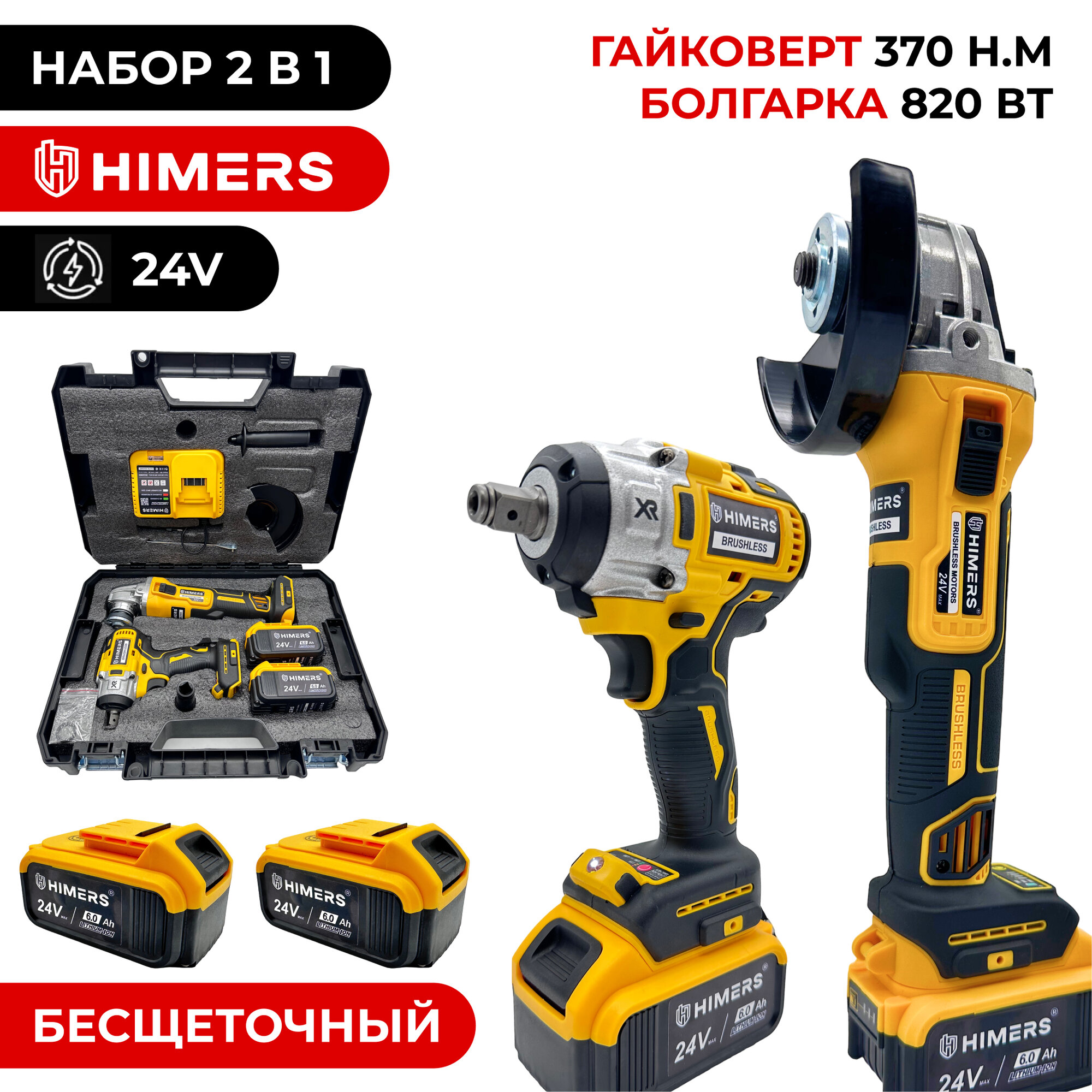 УШМ болгарка и гайковерт 2 в 1 бесщеточные HIMERS DMT370Y-BL 370 Н. М. + DUM820Y 820 ВТ, 24V, 2 АКБ по 6 А. ч, Кейс / для закручивания, шлифовки, полировки, отпила, квадрат 1/2 + винтоверт под биту