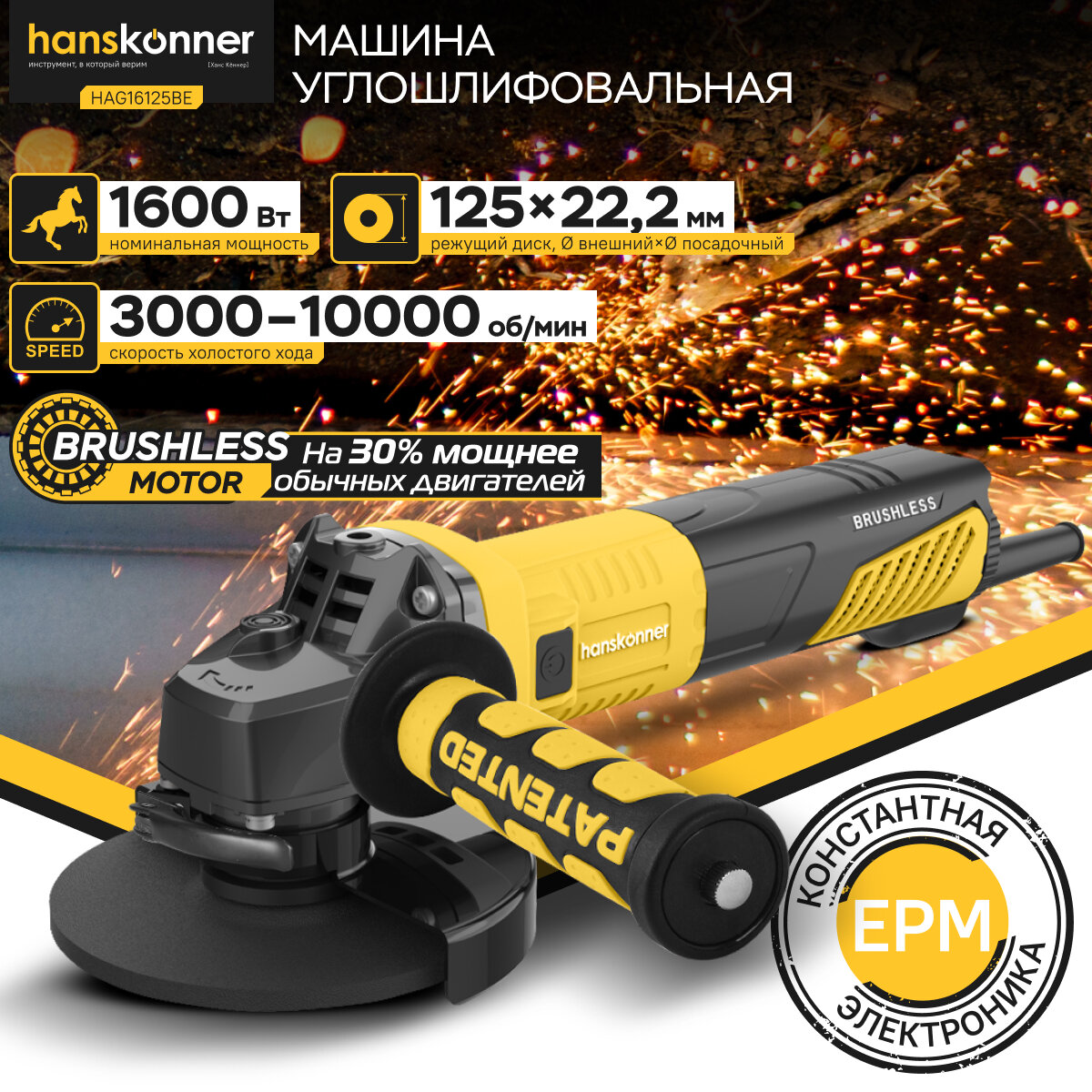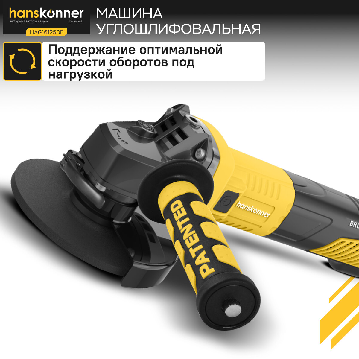 Угловая шлифовальная машина Hanskonner HAG16125BE — мощный и компактный электроинструмент для шлифования и зачистки поверхностей, а также резки металлов, кирпича, керамики или камня без использования воды. Данная модель имеет бесщеточный электродвигатель мощностью 1600 Вт и фирменные японские подшипники NSK, что повышает продуктивность и рабочий ресурс. Также, ресурс инструмента, подкреплен герметичным выключателем, функцией плавного пуска и защитой от перегрузки двигателя.
