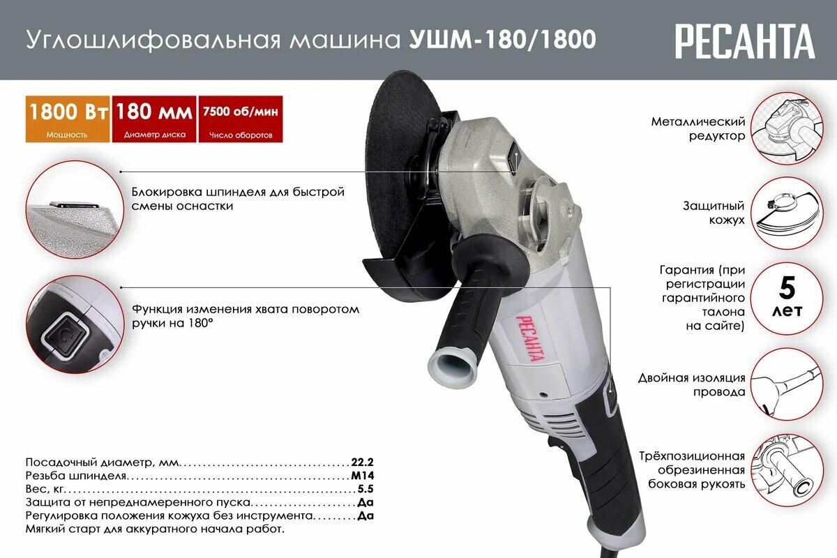 УШМ Ресанта УШМ-180/1800, защитный кожух, трехпозиционная рукоятка, диск 18 см