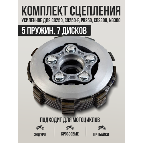 Усиленное сцепление в сборе от ZONGSHEN для эндуро и кроссовых мотоциклов ( хонда, мотолэнд, брз, мотакс, регульмото, кайо) с двигателями ZS166FMM (CB 250), 172FMM (CB250-F, PR250), 174MN (CBS300, NB300) предназначено для повышения надежности и производительности в условиях экстремальной эксплуатации. Это сцепление, имеет 5 пружин (болтов) и 7 фрикционных дисков.