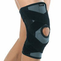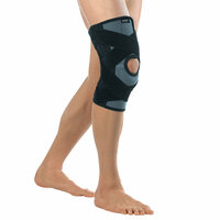 Бандаж на коленный сустав, разъемный в области нижней трети бедра, с отверстием и стабилизирующим полукольцом для надколенника. Снабжен парой нижних и парой верхних скрестнозакрепляющихся эластичных фиксирующих ремней. Наколенник усилен по боковым поверхностям двумя парами пружинных ребер. Свойства материала позволяют использовать ортез при повышенной потливости.