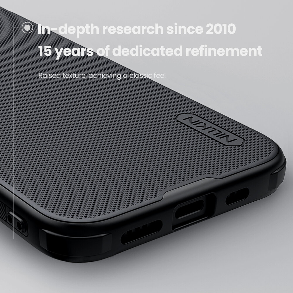 Оригинальный усиленный двухкомпонентный чехол черного цвета от Nillkin серии Super Frosted Shield Pro для смартфона Айфон 16е. Cерия чехлов Super Frosted Shield Pro от Nillkin имеет усиленные боковые рамки по четырем углам с высокой защитой от повреждений, пыли и грязи, а также обладает приятными тактильными ощущениями на прикосновения. Чехол двухкомпонентный и изготавливается из поликарбоната (PC) и мягкого термо-полиуретана (TPU). Чехол от Nillkin серии Super Frosted Shield Pro разработан специально для телефона iPhone 16e