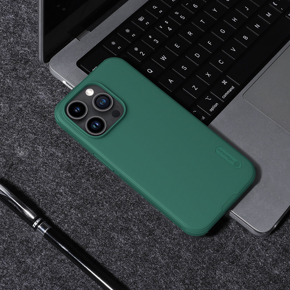 Оригинальный усиленный чехол с функцией поддержки магнитной беспроводной зарядки MagSafe зеленого цвета (Deep Green) от Nillkin серии Super Frosted Shield Pro Magnetic для смартфона Айфон 15 Про Cерия чехлов Super Frosted Shield Pro Magnetic от Nillkin имеет усиленные боковые рамки по четырем углам с высокой защитой от повреждений, пыли и грязи, а также встроенный в чехол магнит для использования зарядки MagSafe. Чехол двухкомпонентный и изготавливается из поликарбоната (PC) и мягкого термо-полиуретана (TPU). Чехол Nillkin серии Super Frosted Shield Pro Magnetic разработан специально для телефона iPhone 15 Pro