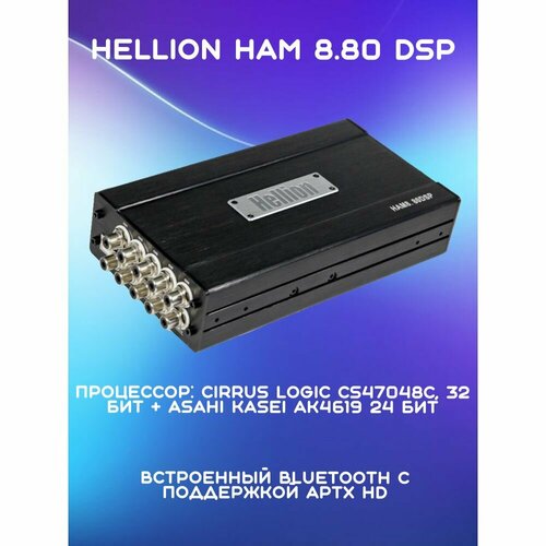 Hellion HAM 8.80DSP — это многофункциональный процессор-усилитель для автомобилей и мототехники, обладающий особыми возможностями, выделяющими его из ряда прочих подобных ему устройств. Основной особенностью, отличающей HAM 8.80DSP от аналогов, является то, что все каналы встроенного в него процессора, являются «сквозными», что не ограничивает владельца в использовании любого количества внешних усилителей и не делает систему с ним «конечной», как в случае с большинством таких устройств. Вы можете в любых каналах, использовать или встроенные усилители или подключить внешние, что позволяет на выходе получить любую необходимую вашим компонентам мощность, а это даёт возможность развивать систему постепенно или даже сделать две «параллельных» системы в одном автомобиле. При желании, встроенный усилитель можно отключить и использовать HAM 8.80DSP просто как процессор, что ранее никогда не встречалось в такой продукции и является ещё одной отличительной особенностью. Возможности питания и очень компактные размеры корпуса, позволяют не только использовать HAM 8.80DSP в автомобилях (в том числе и оснащённых системой START/STOP), но и прямо указывают на возможность применения на мотоциклах, благодаря очень невысокому потреблению тока (всего 540 мА в режиме усилителя и 330 мА в режиме процессора), что является важным фактором для этой техники. Hellion HAM 8.80DSP изготовлен во влагозащищённой версии IP 54, что значительно расширяет возможности его применения не только в автомобилях и на мототехние, но и в катерах и на яхтах (где возможности встроенного процессора, позволят вам организовать систему с несколькими разными зонами прослушивания! При всём при этом, встроенный усилитель способен удивить впечатляющей мощностью, которая составляет 110 Вт в каждом из восьми каналов при использовании нагрузки в 2 Ом! Из списка преимуществ, также невозможно исключить очень гуманную и «справедливую» стоимость этого замечательного аппарата, что при всех прочих плюсах, делает его доступным для очень широкого круга потребителей! Характеристики: Количество каналов процессора: 10Количество каналов усилителя: 8Класс встроенного усилителя: широкополосный D класс TPA3116Влагозащищённость: IP54Выходная мощность RMS: 8х60 Вт/4 Ом, 8х110 Вт/2 ОмВходы высокого уровня: 8Входное напряжение для входов ВУ: с 1 по 6 - до 14 В, 7 и 8 - до 32 ВПроцессор: Cirrus Logic CS47048C, 32 бит + Asahi Kasei AK4619 24 битЦифровые, независимые входы: оптический TosLink, USB-audioBluetooth-аудио модуль: 5.0, HD-audio, HI-RES audioДополнительный независимый вход: RCA, 2 каналаДxШxВ: 195x106x43 ммВес: 1500 г
