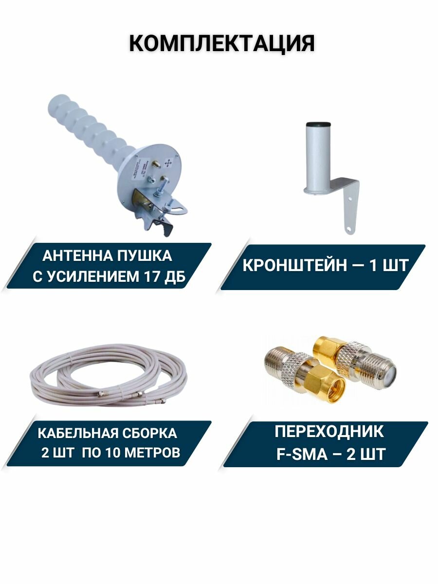 Пушка 4G MIMO AP17-1800F — это двойная антенна для модемов и 4G-роутеров с усилением 17 дБи, работающая в диапазоне частот 1800 МГц (LTE Band 3).