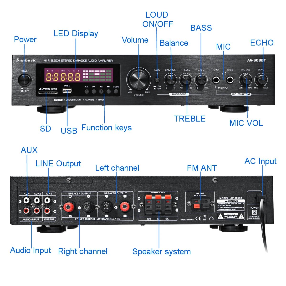 Усилитель мощности SUNBUCK для домашнего кинотеатра, 2000 Вт, 220/110 В, Bluetooth, 608BT Gold, EU Plug: сравнение цен, характеристики, фото, актуальное наличие и цены.