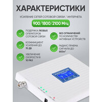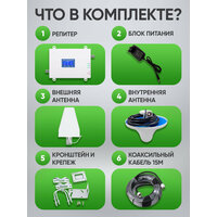 Усилитель сигнала сотовой связи и интернета, репитер - 1шт Внутренняя антенна - 2 шт Внешняя антенна - 1шт Кабель 15м - 1шт Блок питания - 1шт Инструкция на русском языке - 1шт Монтажный комплект - 1шт