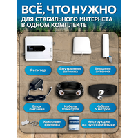 Репитер - 1шт., блок питания, кабель 10 метров и 5 метров, внешняя антенна 1шт.,внутренняя антенна - 1шт., инструкция на русском языке.