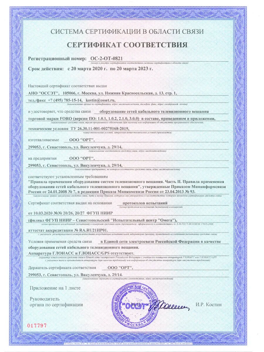 Изделия имеют класс защиты II по электробезопасности в соответствии ГОСТ IEC 60065-2013. Гарантийный срок эксплуатации 18 месяцев. Сертификат соответствия системы сертификации РФ в области связи. Регистрационный номер сертификата: ОС-2-ОТ-0821.