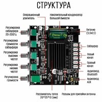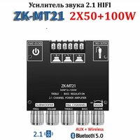 Характеристики цифрового аудио усилителя звука для колонок с Bluetooth 5.0 ZK-MT21L 2.1 -канальный модуль усилителя мощности звука высоких и низких частот. Независимая регулировка высоких и низких частот левого и правого каналов, плавная настройка на 360 градусов. Плата поддерживает подключение по Bluetooth 5.0 и через AUX. Особенности: Bluetooth 5.0 имеет высокую точность и 2.1 стерео-звук. Усилитель звука отлично подходит для колонок, автомобильных динамиков или домашних стерео систем. Динамики должны быть пассивными. Переходник для подключения питания в комплекте, разъем для подключения питания имеет стандарт 5,5- 2,1/2,5мм. Принцип работы: по умолчанию первым активируется Bluetooth, если нужно воспроизвести музыку с AUX просто подключите AUX, усилитель автоматически переключиться в AUX, если нужно вернуть обратно в Bluetooth необходимо отключить AUX. Модель: ZK-MT21 2.1 50WX2+100W channel Bluetooth 5.0 Расстояние передачи: до 15 м Материал: пластик Размер: 93 мм * 90 мм * 22 мм Напряжение питания: DC 12–24 5А В пост. тока (чем выше напряжение, тем выше выходная мощность, и качество звука) Если напряжение слишком низкое усилитель может выключаться при увеличении громкости. Так же низкое напряжение влияет на качество звука. Рекомендуемое напряжение питания: DC 19V 2-5А Рекомендуем блок питания, артикул для поиска на яндексе : 5687289685 или его аналог. Адаптированные динамики: 0-200 Вт 4 Ом 8 Ом Регулировка громкости: бесступенчатая настройка на 360 градусов Количество каналов: 2 (стерео) по 50W + 1 сабвуфер 100W Используемые аудио чипы учителя звука 2 шт. CS8673E радиатор охлаждения находиться непосредственно на них. Аудио вход: Bluetooth+ AUX Максимальная мощность на канал: 50 Вт Механизм защиты: защита от перегрева, защита от короткого замыкания, защита от перегрева Цвет: черный Вес: 130 г Примечание: Выходная мощность источника питания должна быть больше, чем Выходная мощность усилителя, в противном случае это повлияет на качество звука. Плата поставляется в разобранном виде.