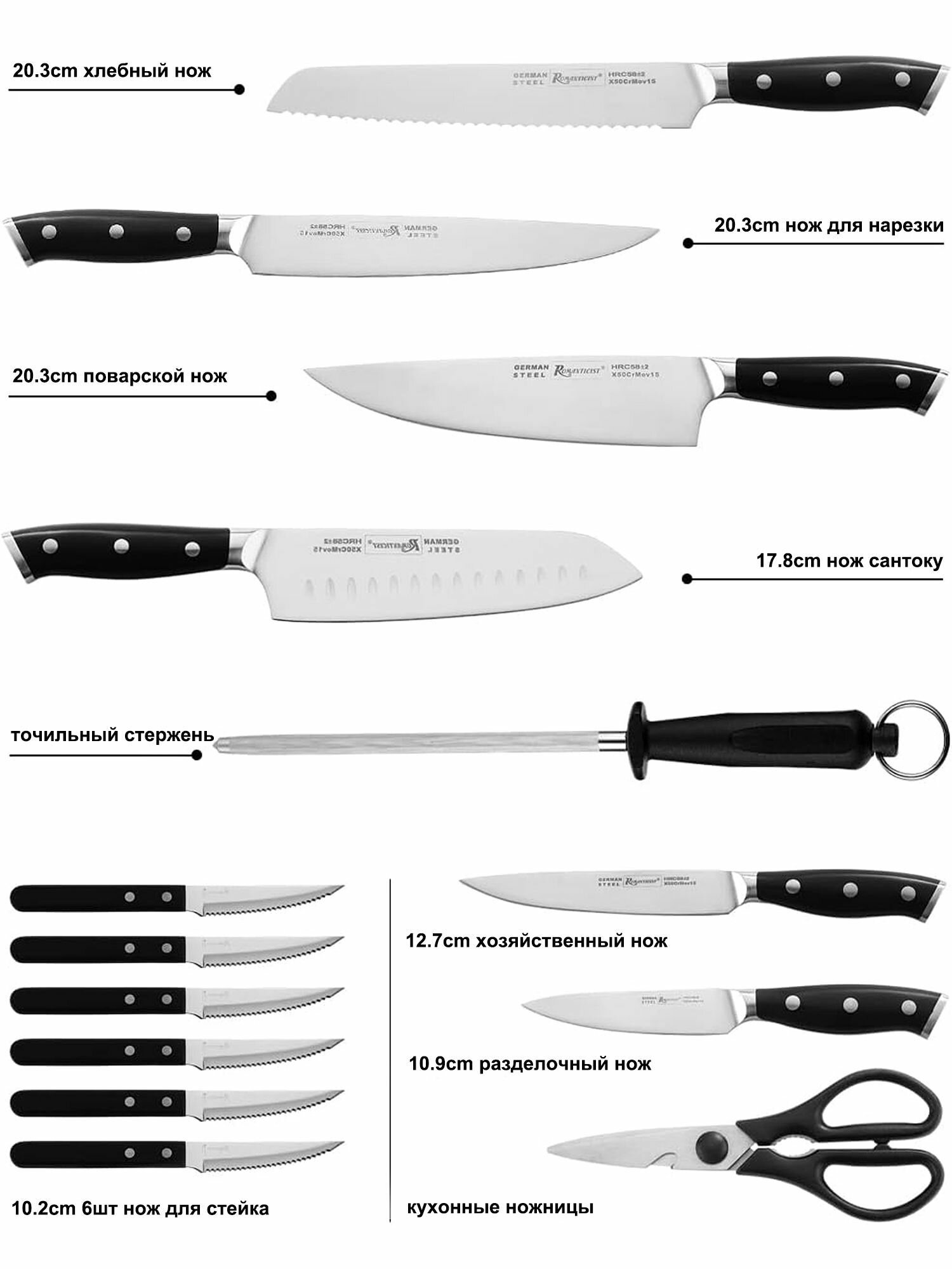 - 6 стейковых ножей – для идеальной нарезки мяса