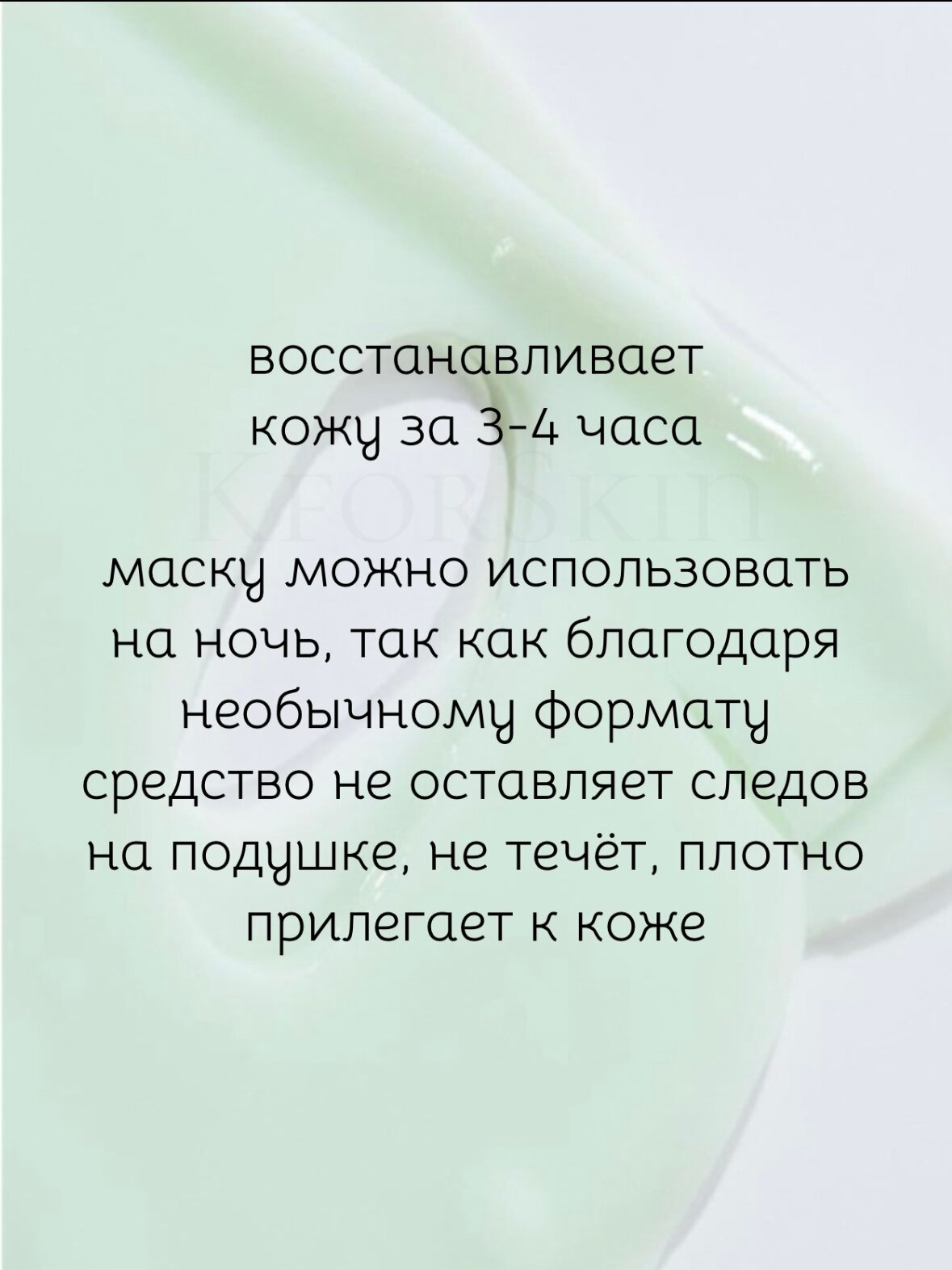 | Способ применения | отделите защитный слой от обеих частей маски. После очищения, тонизирования и использования сыворотки нанесите маску на лицо, снимите через 3-4 часа. Средство можно оставить на коже на всю ночь. |