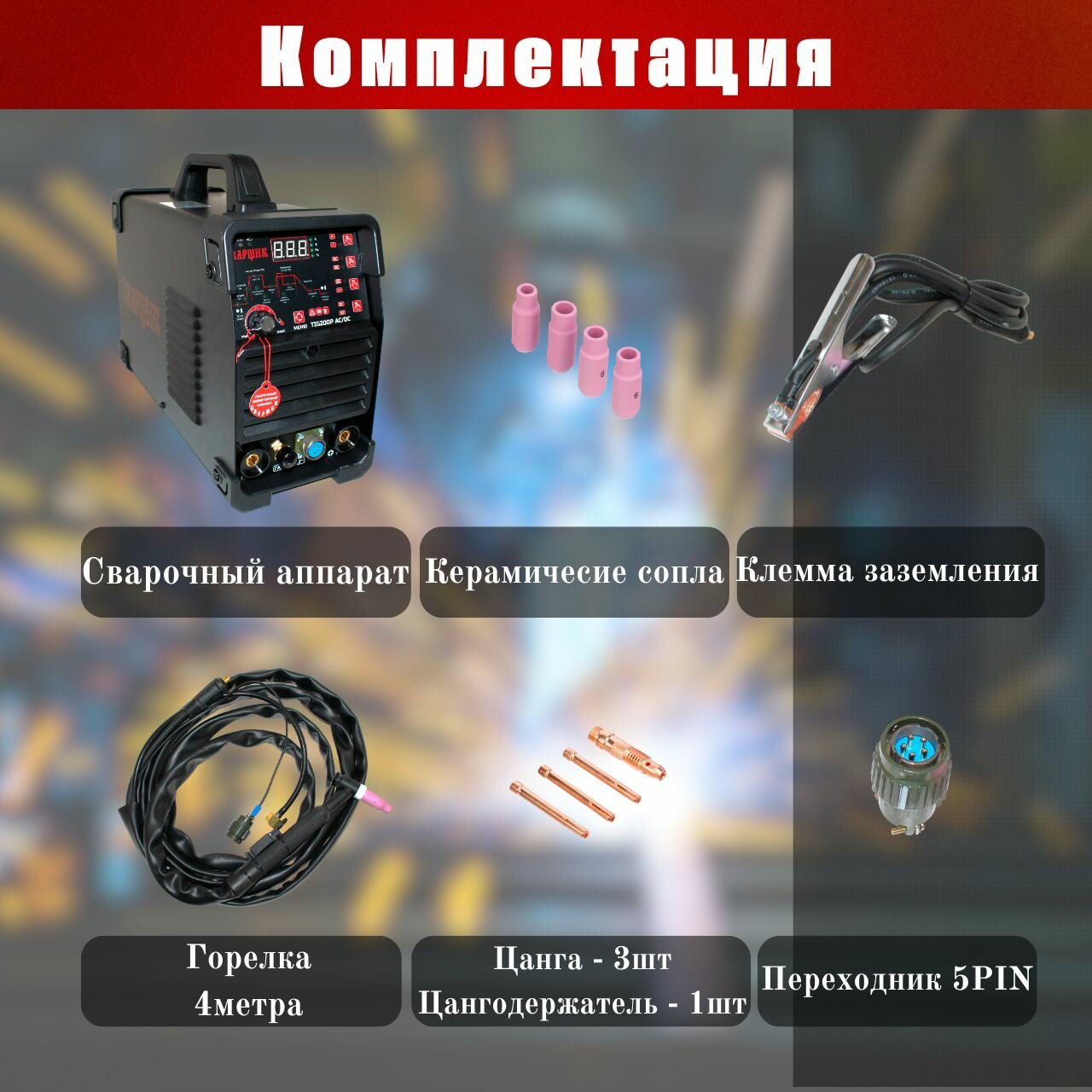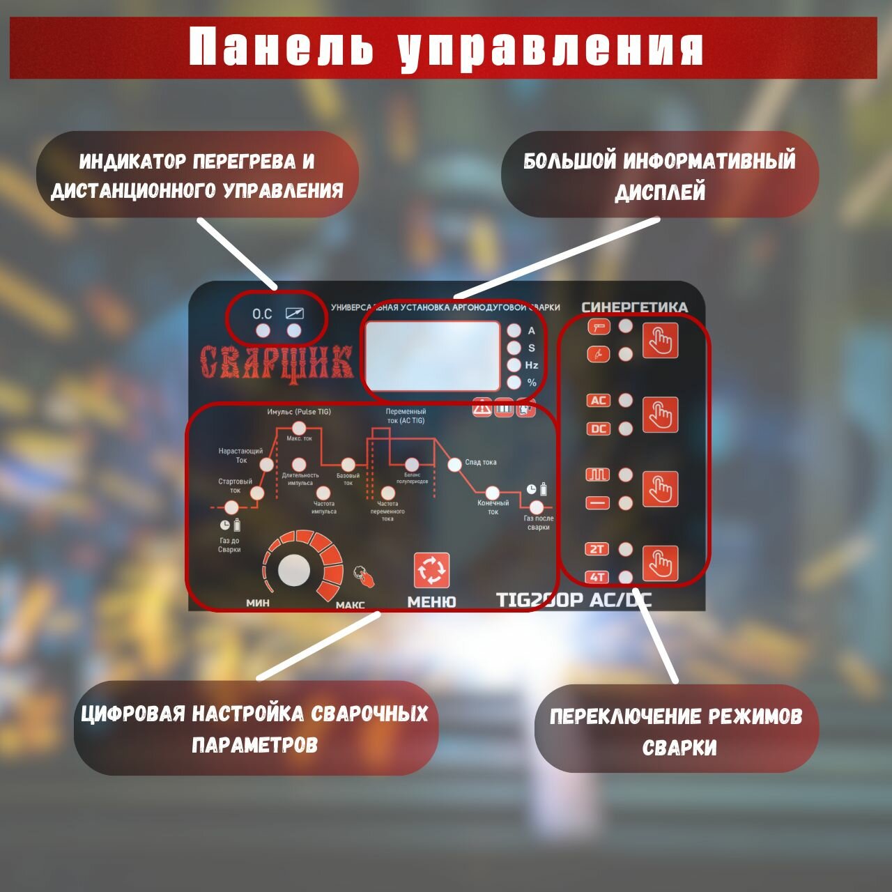 - Включая режим пульсации TIG P для сварки цветных металлов.
