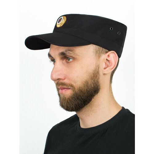 Полицейская кепка с кокардой и люверсами для гардероба сотрудников внутренних ведомств Российской Федерации. Модель выполнена из однотонной ткани иссиня-черного цвета. Ее состав отличается повышенной прочностью и износоустойчивостью. За счет особенного плетения синтетических нитей, входящих в состав ткани, любые разрывы, порезы, появляющиеся в ходе носки, не прогрессируют. Это достигается путем перекрещивания нейлоновых или полиэстровых нитей, образующих сетку размером в пять миллиметров. Полицейская фуражка сделаны в виде "бейсболки" с козырьком, прошитым строчкой. Жесткость козырьку придает вшитый толстый картон. Основание кепки выполнено в форме цилиндра и состоит из трех частей. Кокарда прорезинена и пришита посередине, ровно по центру.