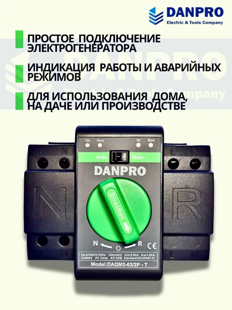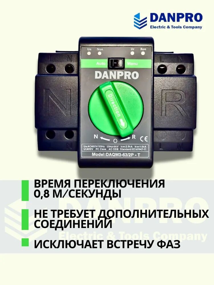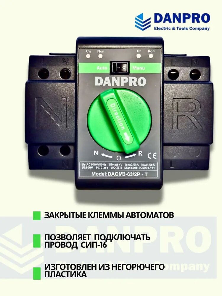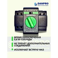 АВР устройство автоматического ввода резерва DANPRO DAQ3Black-63/2P используется для автоматического перехода на резервную систему питания в трёхфазных сетях переменного тока с частотой сети 50 Гц номинальным рабочим напряжением 120 ~ 240 В и номинальным рабочим током до 63 А. Для работы на промышленных, коммерческих и жилых объектах.