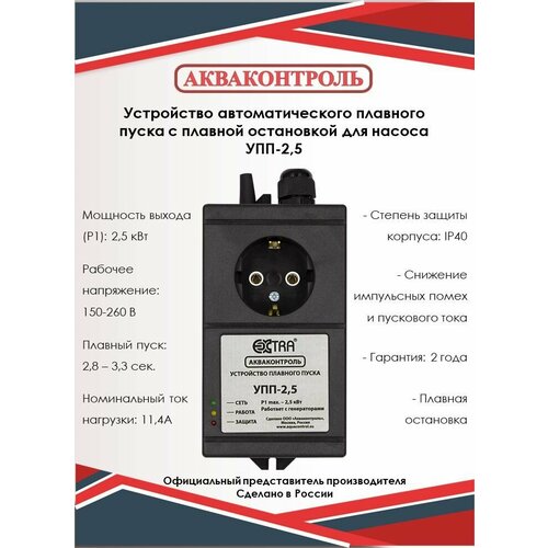 Устройство плавного пуска для насоса Extra Акваконтроль УПП-2,5. Практичный и функциональный модуль адаптивного запуска насоса УПП-2.5 с креплением на стену или другие вертикальные поверхности имеет широкий диапазон использования. Оборудование применяется для работы в комплексе с центробежными насосами скважинного и поверхностного типов, гарантируют плавный запуск агрегата в диапазоне напряжений от 160 до 260 Вольт.
