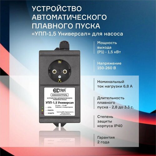 Устройство плавного пуска для насоса и электроинструмента Extra Акваконтроль УПП-1,5 Универсал предназначено для плавного включения бытовых насосов. Его также можно использовать для управления любыми асинхронными электродвигателями мощностью не более 1,5 кВт. Климатическое исполнение УПП соответствует УХЛ3 и предусматривает применение в умеренном и холодном климате в закрытом помещении, где отсутствует искусственная регулировка температуры. Устройство плавного пуска для насоса и электроинструмента Extra Акваконтроль УПП-1,5 Универсал имеет компактный корпус, который исключает попадание частиц мусора размером 1 мм и устойчив к механическим повреждениям.