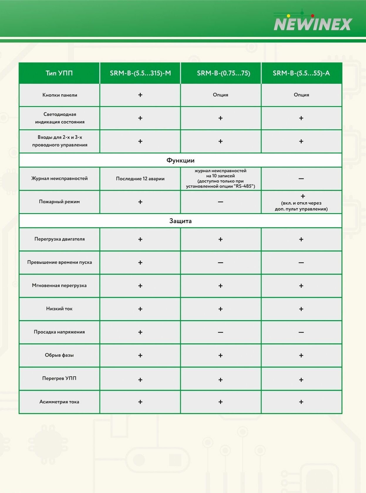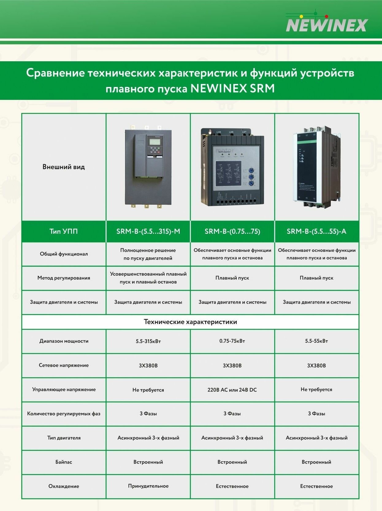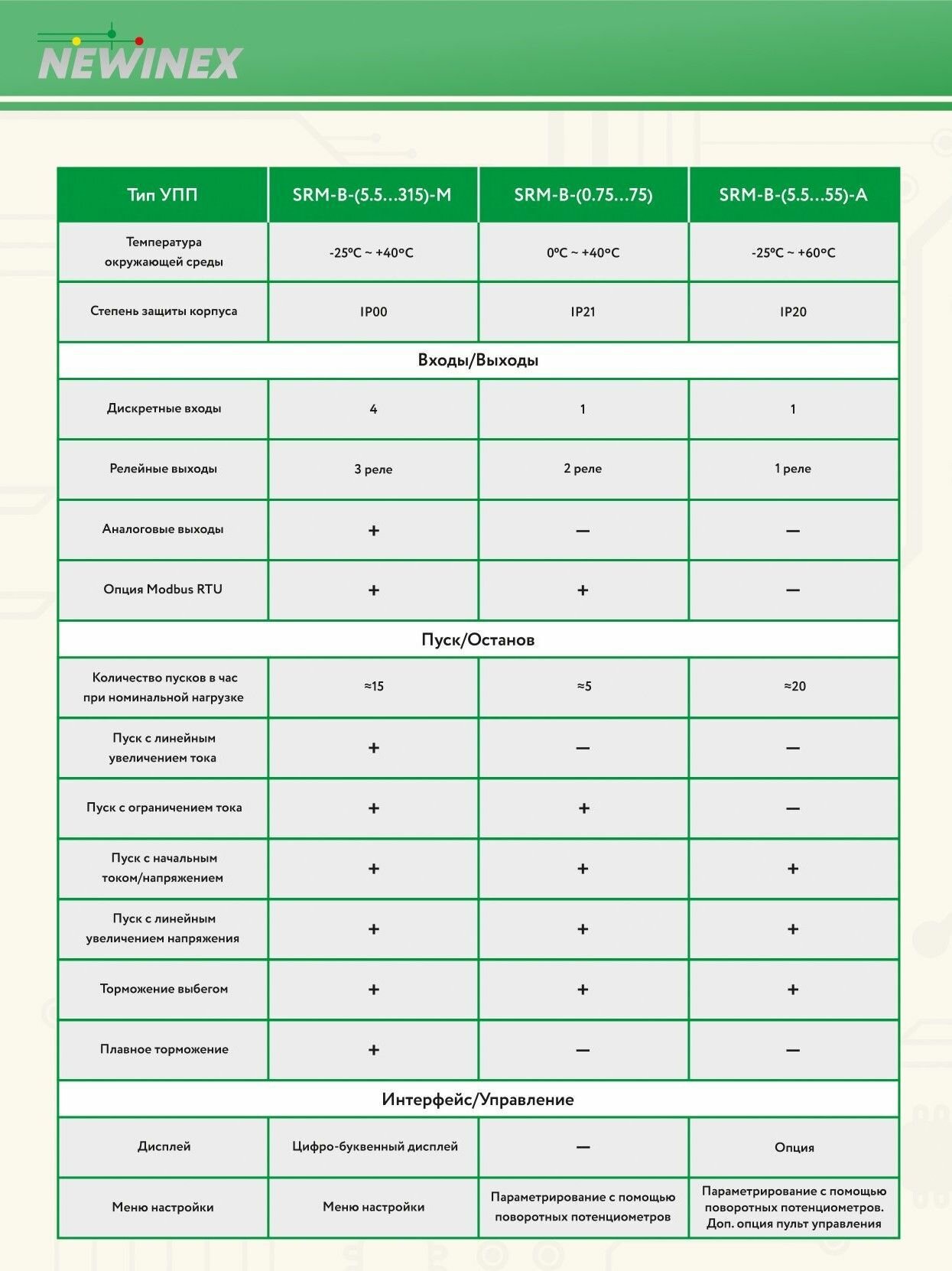 Серия устройств плавного пуска “ SRM-(0.75…75)-B” NEWINEX — это надежные и качественные компоненты, прошедшие тестирование и выпускаемые под техническим контролем специалистов компании. УПП данной серии поддерживают протокол удаленной связи с помощью ModbusRTU, оснащены 2-мя дискретными выходами, компактны, просты в установке и подключении. Все устройства плавного пуска имеют встроенный байпас (не требуется установка внешнего пускателя). Диапазон мощности УПП от 0,75 до 75 кВт. УПП имеют следующие функции: • плавный пуск при начальном пусковом напряжении и плавный останов. Все требуемые параметры пуска и останова регулируются тремя различными потенциометрами • Два варианта подключений трехфазного электродвигателя: "внешняя цепь" и "внутренняя цепь". Для варианта "внешняя цепь" двигатель может быть подключен как по схеме "звезда", так и "треугольник"; • показания в реальном времени как текущих фазных токов, так и среднего потребляемого тока (доступно только при установленной опции "RS-485"); • журнал неисправностей на 10 записей (доступно только при установленной опции "RS-485"); • статистические данные по работе УПП (доступно только при установленной опции "RS-485"); • защита как электродвигателя, так и самого устройства - от 5,5.8-кратной перегрузки по току (перенастройка доступна только при установленной опции "RS-485"); - от перегрузки по мощности (тепловая защита, перенастройка на различные классы доступна только при установленной опции "RS-485"); - от дисбаланса фазных токов; - от пропадания одного либо двух, фазных напряжений - от перегрева УПП; • один "Пуск/Стоп" дискретный управляющий вход; • два выхода типа "сухой контакт" (сигнализация включенного состояния и состояния неисправности).