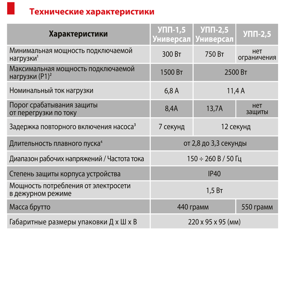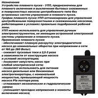 НазначениеУстройство плавного пуска - УПП, предназначены для плавного включения и выключения бытовых скважинных и поверхностных насосов центробежного типа без встроенных систем управления и плавного пуска. График плавного пуска УПП оптимизирован для управления центробежными поверхностными и скважинными насосами, работающими в условиях правильно подобранной рабочей зоны. УПП можно использовать для управления ручным электроинструментом, не имеющим встроенной электронной системы управления и плавного пуска. Применение плавного пуска:- обеспечивает плавную раскрутку электродвигателя насоса до номинальных оборотов при напряжении в сети от 160 до 260 Вольт;- снижает пусковые токи в 2,5-3 раза в зависимости от конструкции насоса и условий эксплуатации;- позволяет запустить насос при слабой электрической сети;- позволяет использовать для питания насоса дизельные или бензиновые электрогенераторы, с номинальной мощностью, превышающей мощность насоса Р1в полтора раза;