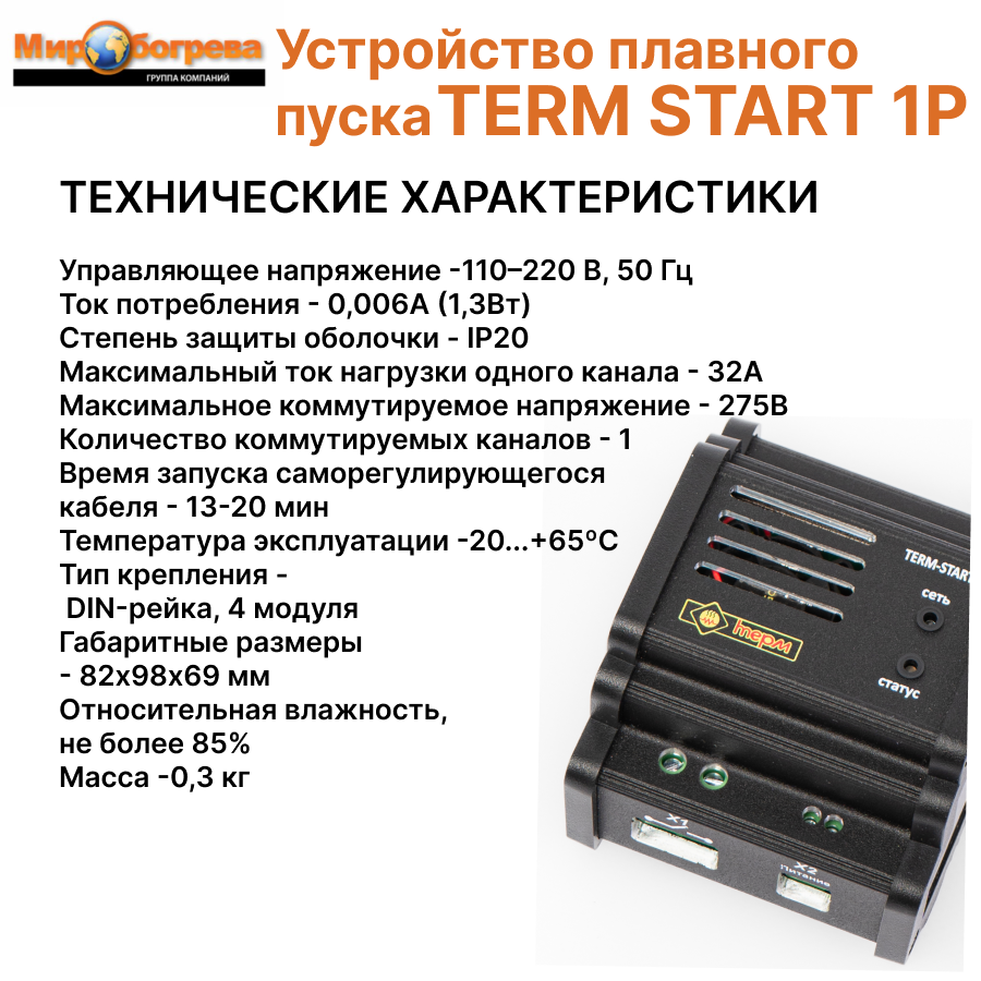 Прибор TERM-START 1P предназначен для коммутации саморегулирующихся нагревательных кабелей с функцией ограничения пусковых токов на уровне номинального.