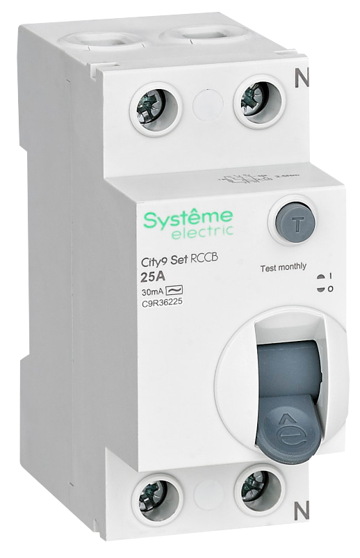 Выключатель дифференциального тока (УЗО) 2п 25А 30мА тип AC City9 Set 230В SE C9R36225Выключатель дифференциального тока (ВДТ) или устройство защитного отключения (УЗО) серии City9 Set Systeme Electric, 2-полюсный, номинальный ток 25А, ток утечки 30 мА, тип АС, электромеханический. Применяется в электрических сетях напряжением 230В. Уставка по току утечки 30 мА обеспечивает гарантированную защиту людей при прямом и косвенном прикосновении. Кнопка тест обеспечивает проверку работоспособности аппарата. Крепление на DIN-рейку шириной 35 мм. Подключение сверху и снизу. Безопасные клеммы.