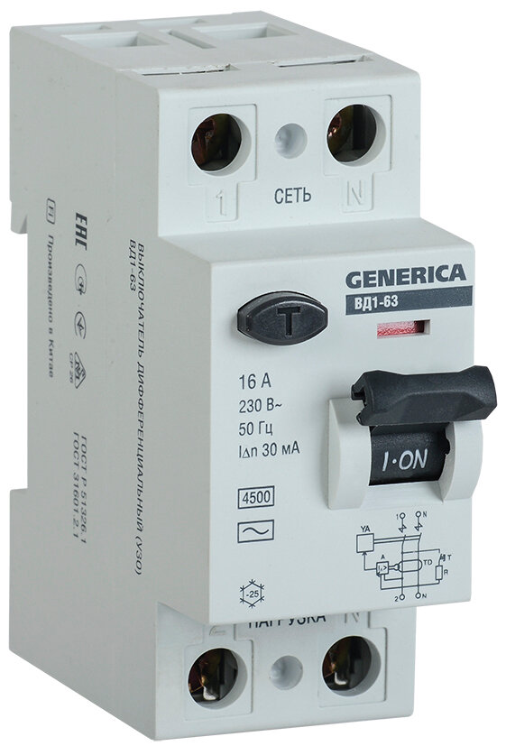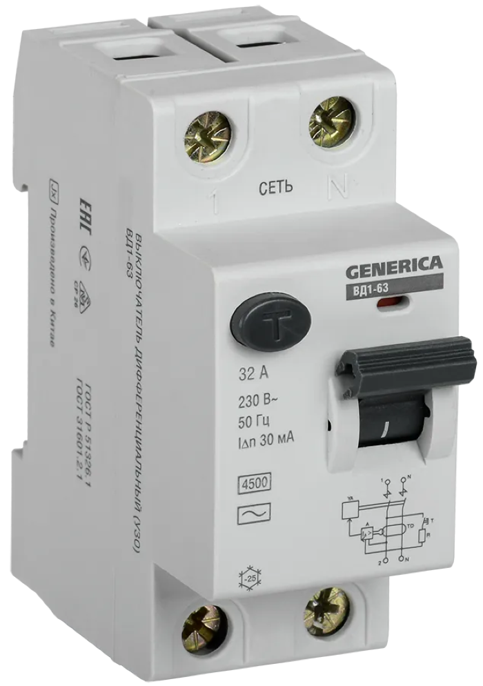 Устройство защитного отключения Generica / Дженерика ВД1-63 двухполюсный, в пластиковом корпусе, белый, 32A 30мА IP20 тип AC, MDV15-2-032-030 / УЗО: сравнение цен, характеристики, фото, актуальное наличие и цены.