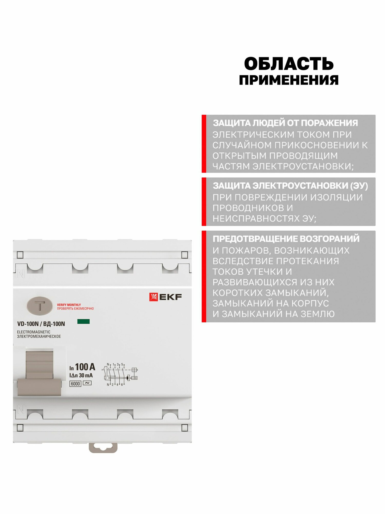 Выключатель дифференциального тока EKF PROXIMA ВД-100N служит для защиты людей от поражения электрическим током, предотвращая аварийные ситуации, вызванные повреждением изоляции проводников и другими неисправностями в электроустановках. Кроме того, устройство защитного отключения помогает избежать возгораний и пожаров за счет своевременного реагирования на токи утечки и предотвращения коротких замыканий и замыканий на землю.