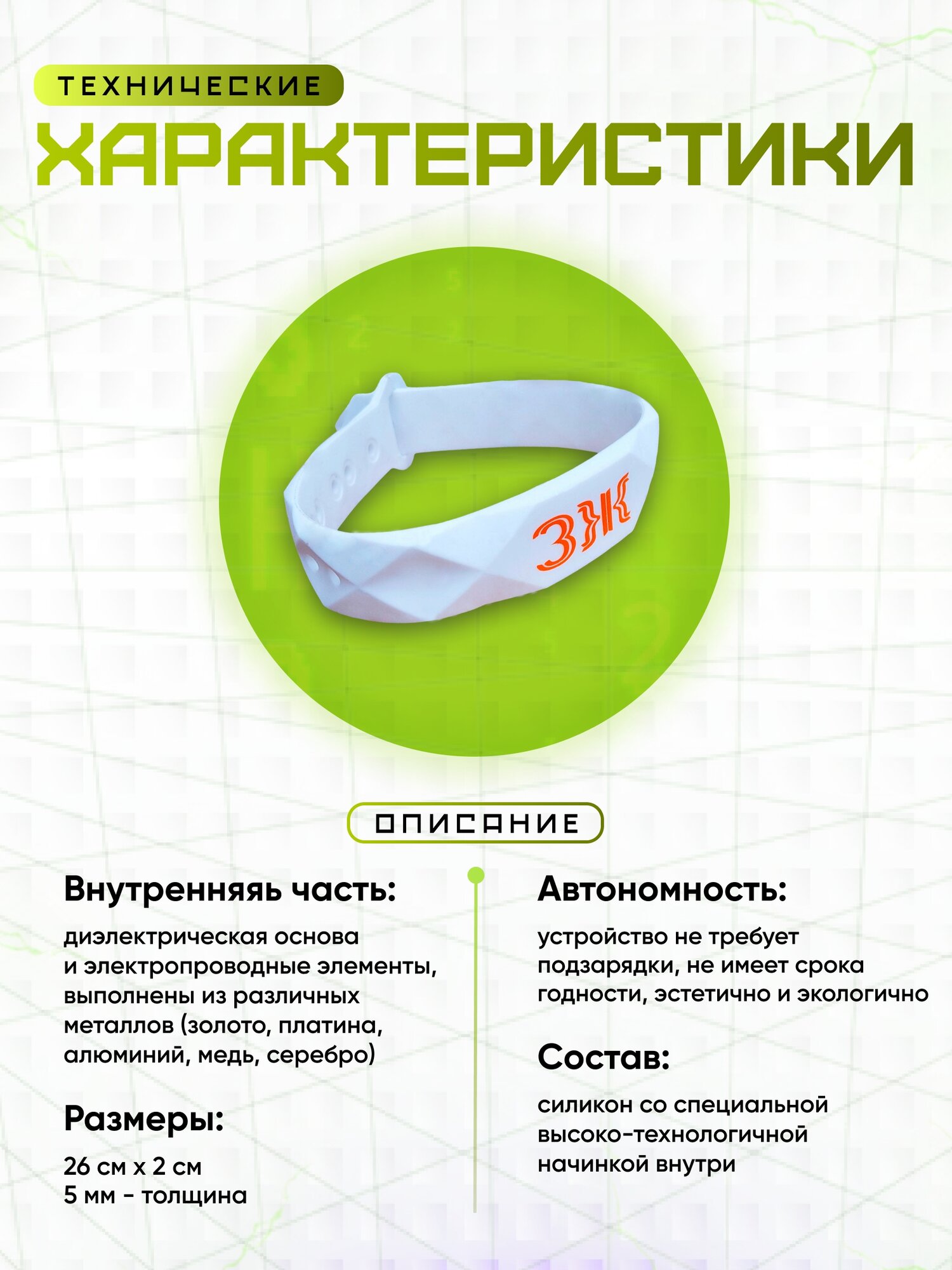 Уникальное устройство защиты от электромагнитных излучений «Защита Жизни» выполнено в виде браслета из силикона со специальной высоко-технологичной начинкой внутри. Размер браслета: 26см х 2см, толщина - 5 мм. Устройство в первую очередь предназначено для защиты человека от вредного воздействия электромагнитного излучения (ЭМИ), исходящего от различных технических устройств: сотовых телефонов, вышек сотовой связи (3G, 4G и 5G), высоковольтных линий электропередач, Wi-Fi-роутеров, СВЧ-печей, электробытовых приборов, силового оборудования на предприятиях. Длину браслета можно регулировать, поэтому устройство подходит как взрослым, так и детям. Браслет выполнен в двух цветах – черном и белом. Устройство рекомендуется носить максимально близко к телу: на запястье руки или в кармане. Ни в коем случае не разрезайте браслет на части и не перекручивайте его, это приведет к потере его работоспособности. Устройство создано томскими учеными из «Лаборатории жизни». Они провели мануально-мышечные тестирования и психо-физиологические исследования методов защиты от ЭМИ с применением методов прикладной кинезиологии и высоких технологий. Были проведены сотни экспериментов и тестов с участием более 500 человек из разных возрастных групп при воздействии мощнейших источников ЭМИ, которые завершились революционным открытием - разработан способ практически полной нейтрализации воздействий электромагнитных волн в широком спектре частот. Созданы антенны, способные вступать во взаимодействие с электромагнитным полем человека и поглощать ЭМИ на всем диапазоне частот. Устройство работает по принципу биоэнергетической антенны или усилителя резонатора собственных частот человеческого организма, взаимодействуя с электромагнитным полем человека, усиливает энергетическое поле человека, нейтрализует вредное воздействие ЭМИ. Человек - это своего рода комплекс энергетических и биомагнитных резонансов и вибраций, которым можно добавить стабильности в сложных обстоятельствах, что и делает наше устройство. Устройство имеет множество свойств: 1) Эффективная защита от всех источников ЭМИ; 2) Существенная помощь организму в восстановлении после заболеваний, вызванных всеми видами штаммов КОВИД-19; 3) Стойкое снижение дозировок противопаразитарных, противовирусных, противогрибковых, антибактериальных препаратов при лечении инвазий; 4) Снижение дозировок при употреблении спортивного и функционального питания, а также большинства необходимых организму витаминов и минералов; 5) Стойкое улучшение функционального состояния памяти и внимания; 6) Улучшение когнитивных функций и умственной выносливости; 7) Улучшение работоспособности и повышение физической активности; спортивных показателей в части выносливости и качества сенсомоторной деятельности; 8) Защита от негативного воздействия информационно-энергетического поля других лиц. Конкурентные преимущества устройства по сравнению с другими подобными устройствами: нейтрализует электромагнитное излучение в широком диапазоне волн; удобно в использовании благодаря небольшим размерам; не требует подзарядки; не имеет срока годности. При правильной эксплуатации устройство может прослужить нескольким поколениям владельцев. Есть множество отзывов на это устройство, подтверждающих его эффективнос