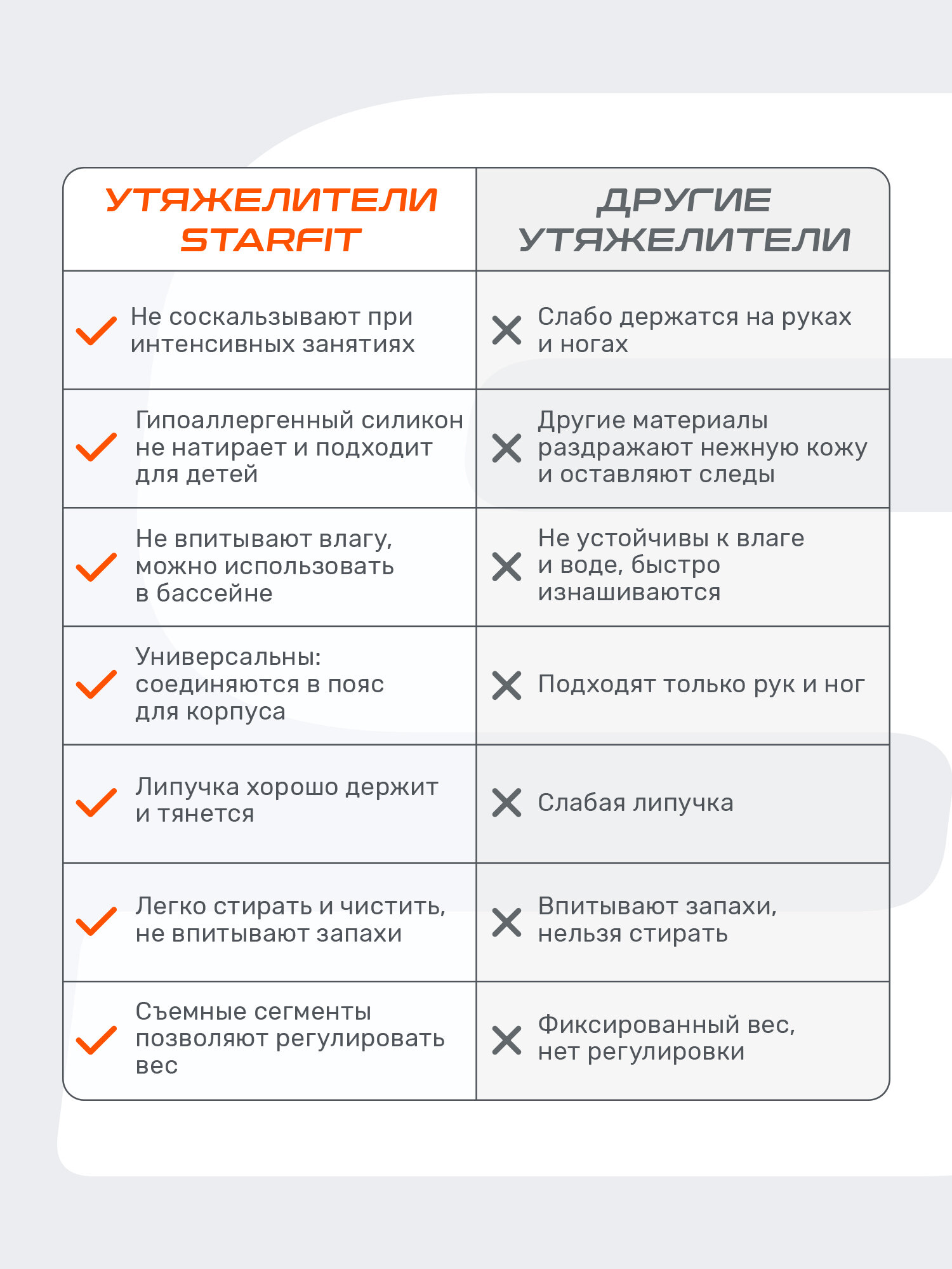 Утяжелители от бренда STARFIT станут отличным дополнением к тренировкам дома, в зале или на свежем воздухе. Они помогают повысить эффективность упражнений, увеличивая нагрузку на мышцы и способствуя развитию силы и выносливости. Утяжелители для ног идеально подходят как для кардиотренировок, так и для силовых упражнений. Силиконовые утяжелители отличаются удобством и практичностью. Гипоаллергенный материал не скользит и комфортно прилегает к коже, не вызывая раздражения и дискомфорта. Силикон не впитывает влагу, что делает аксессуары гигиеничными и простыми в уходе. Дополнительным преимуществом является высокая устойчивость к повреждениям, что позволяет аксессуарам сохранять свои свойства даже при регулярных нагрузках. Съемные сегменты позволяют подобрать оптимальную нагрузку для каждой тренировки. Регулируемая велкро-липучка надежно фиксирует утяжелители для рук, обеспечивая комфортное положение даже при активных движениях. Они подходят для разнообразных тренировок, включая бег, йогу, растяжку, функциональные и силовые упражнения. С их помощью можно задействовать различные группы мышц и повысить интенсивность занятий.