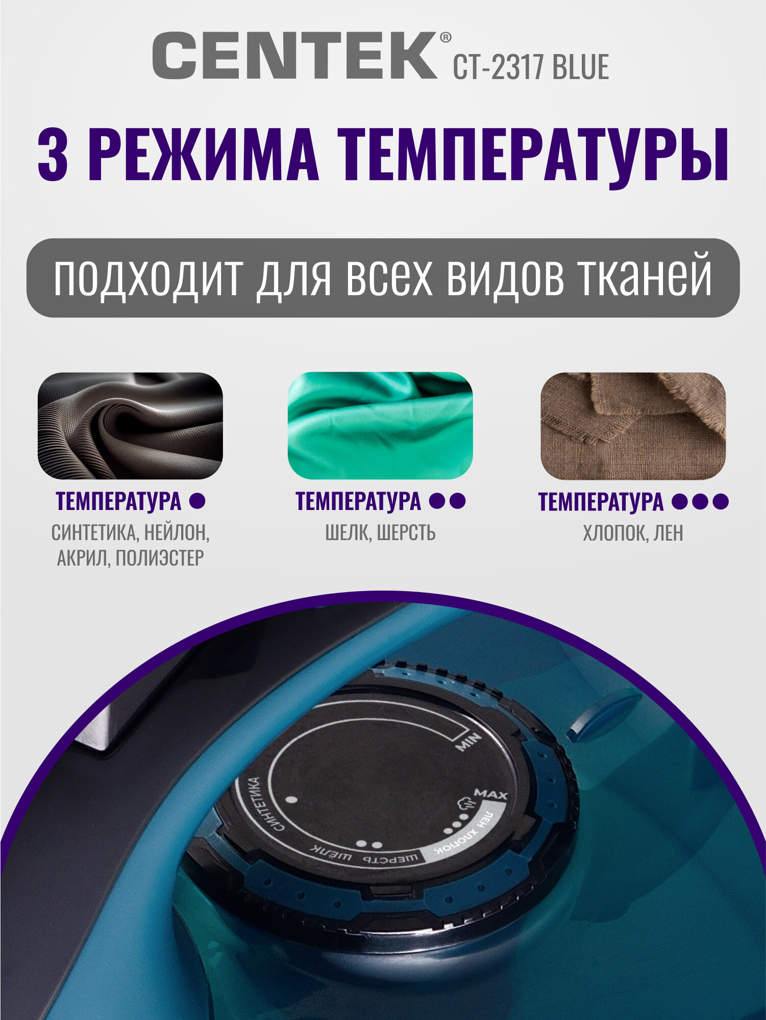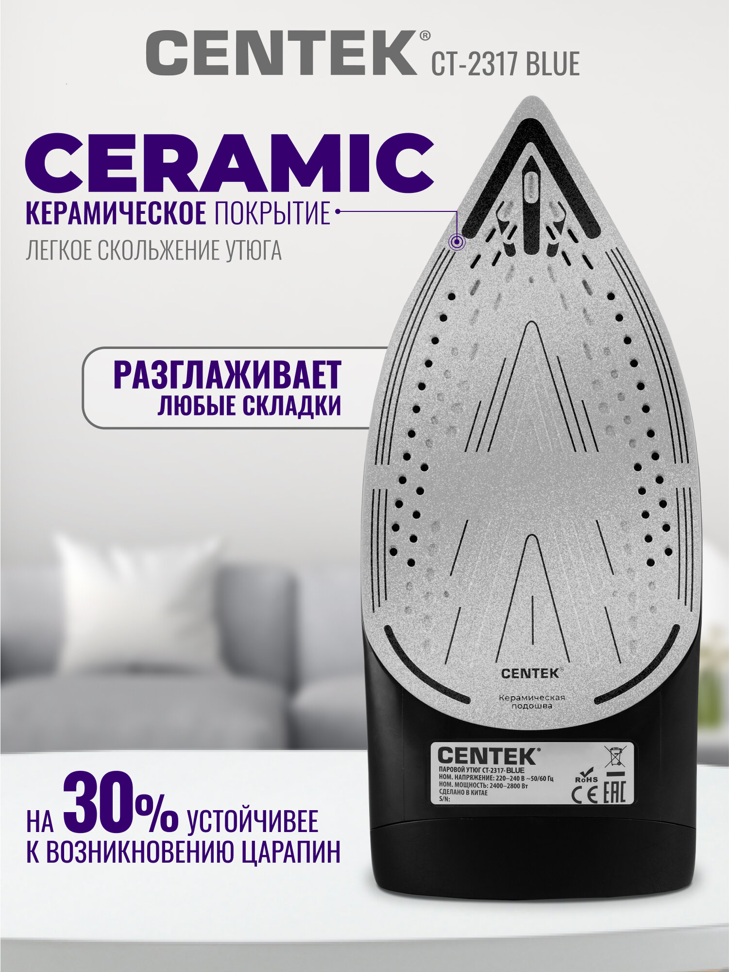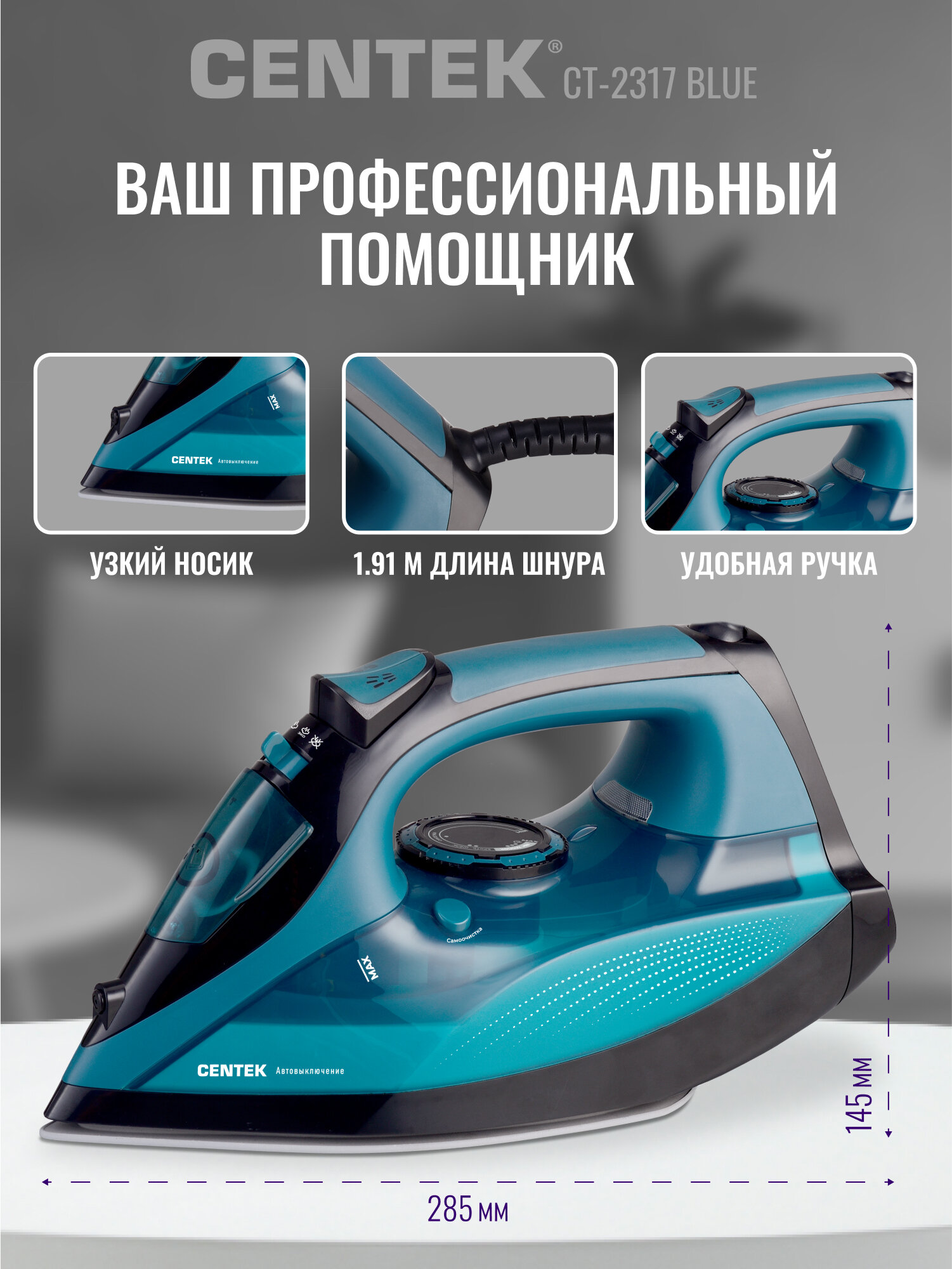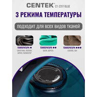 Утюг CENTEK CT-2317 Blue: 2800Вт, керамическая подошва, паровой удар, защита от накипи, автовыключение: сравнение цен, характеристики, фото, актуальное наличие и цены.