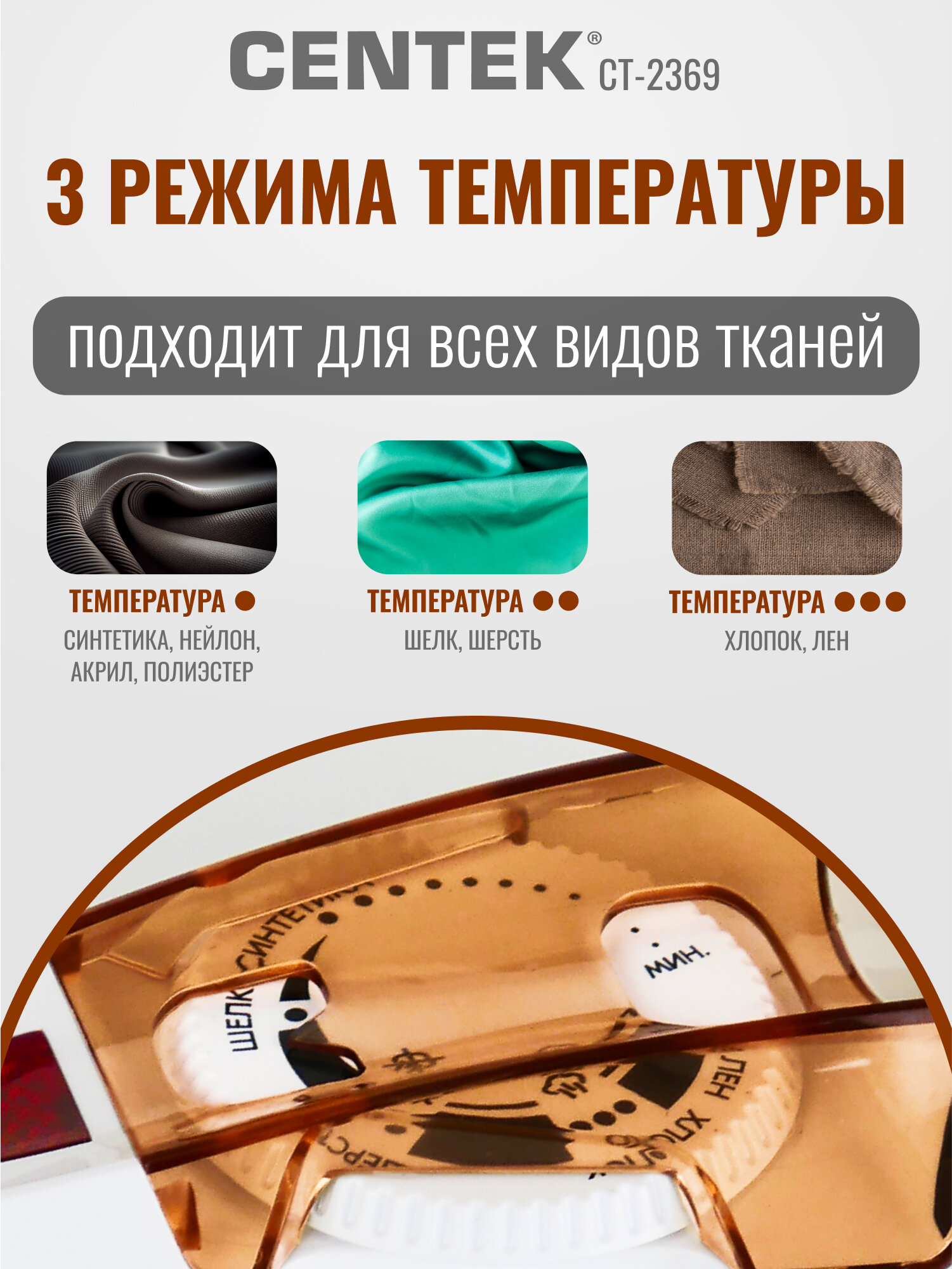 Centek CT-2369 имеет функцию постоянной подачи пара, которая облегчает разглаживание тканей, и паровой удар мощностью 60 г/мин, который справляется с самыми сложными складками. Удобный регулятор температуры позволяет выбрать оптимальный режим для каждого типа ткани. Благодаря удобному расположению кнопок и эргономичной форме ручки, Centek CT-2369 очень удобен в использовании.