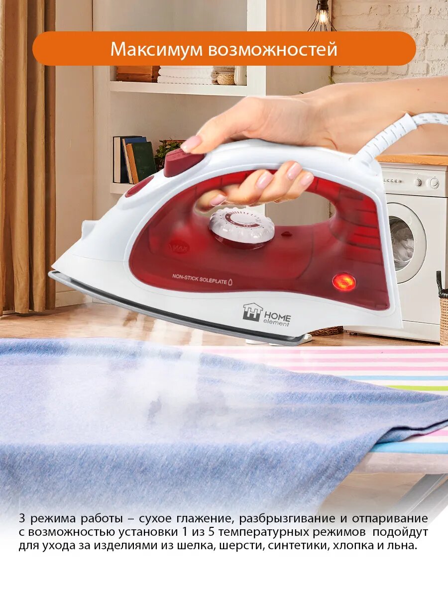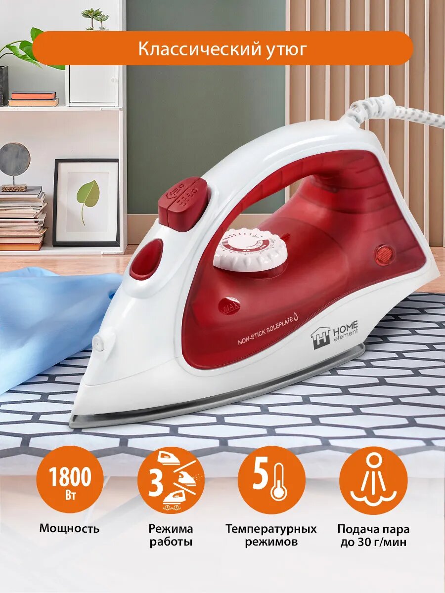 Утюг HOME ELEMENT HE-IR217, красный, мощность 1800 Вт, тефлоновая подошва: сравнение цен, характеристики, фото, актуальное наличие и цены.