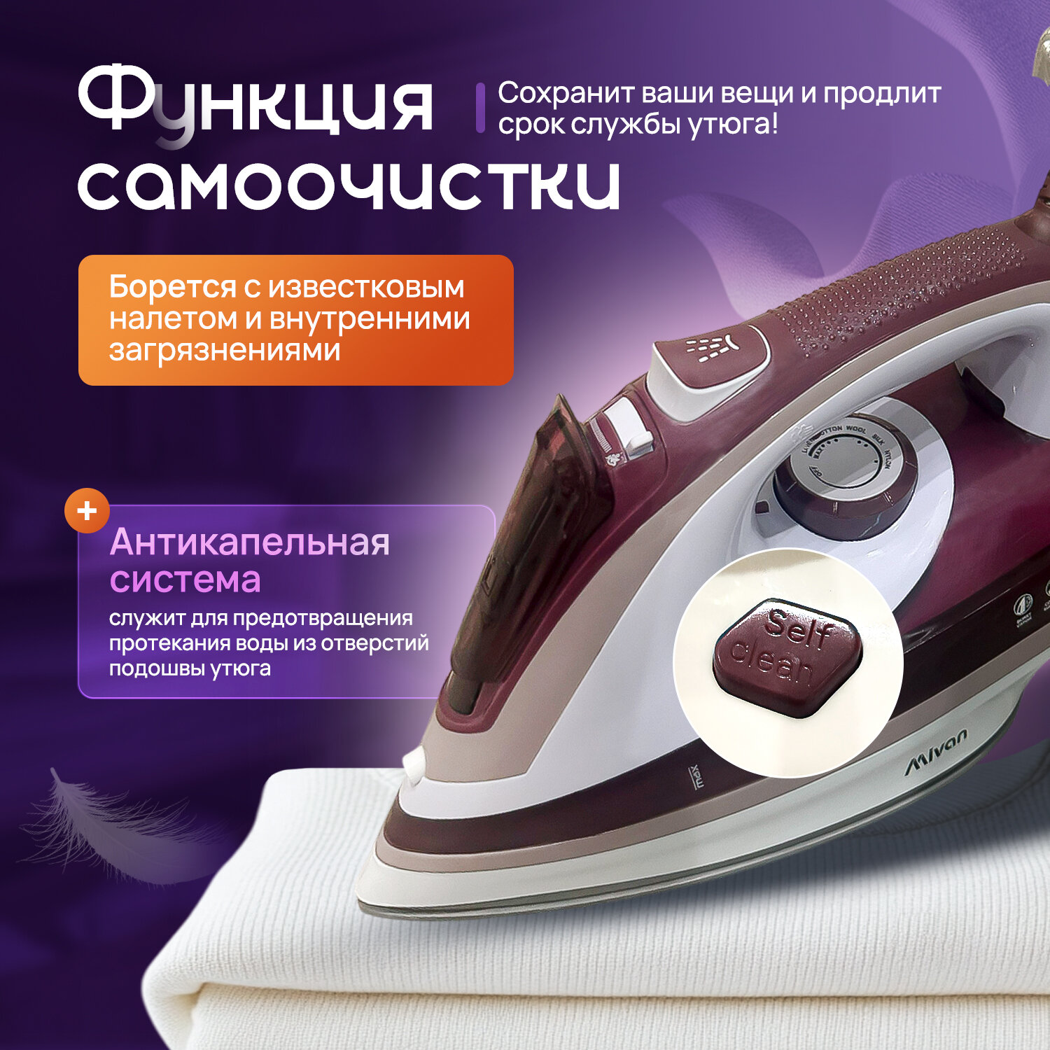 Купить Утюг Mivan мощный электрический для глажки с отпаривателем с самоочисткой бордовый/коричневый/белый с доставкой по всей России.