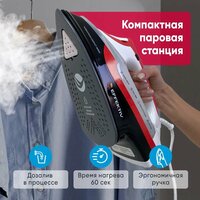 Утюг со встроенным парогенератором. В компактном корпусе размером с обыкновенный утюг нам удалось разместить мощную помпу и паровой нагнетатель с тем, чтобы беспрерывно выдавать пар потоком до 560 миллиграмм в минуту. А также ЖК дисплей и много других полезных инструментов. # Мощная помпа с системой двойного нагнетания – сердце нашего устройства. С помощью него вода из резервуара под давлением поступает на парогенератор мощностью 2800 Ватт. Высокотемпературное реле прецизионно регулирует поток непрерывного перегретого пара. Пар такой температуры не оставляет никакого шанса бактериям и вирусам, что особенно актуально в наше время.