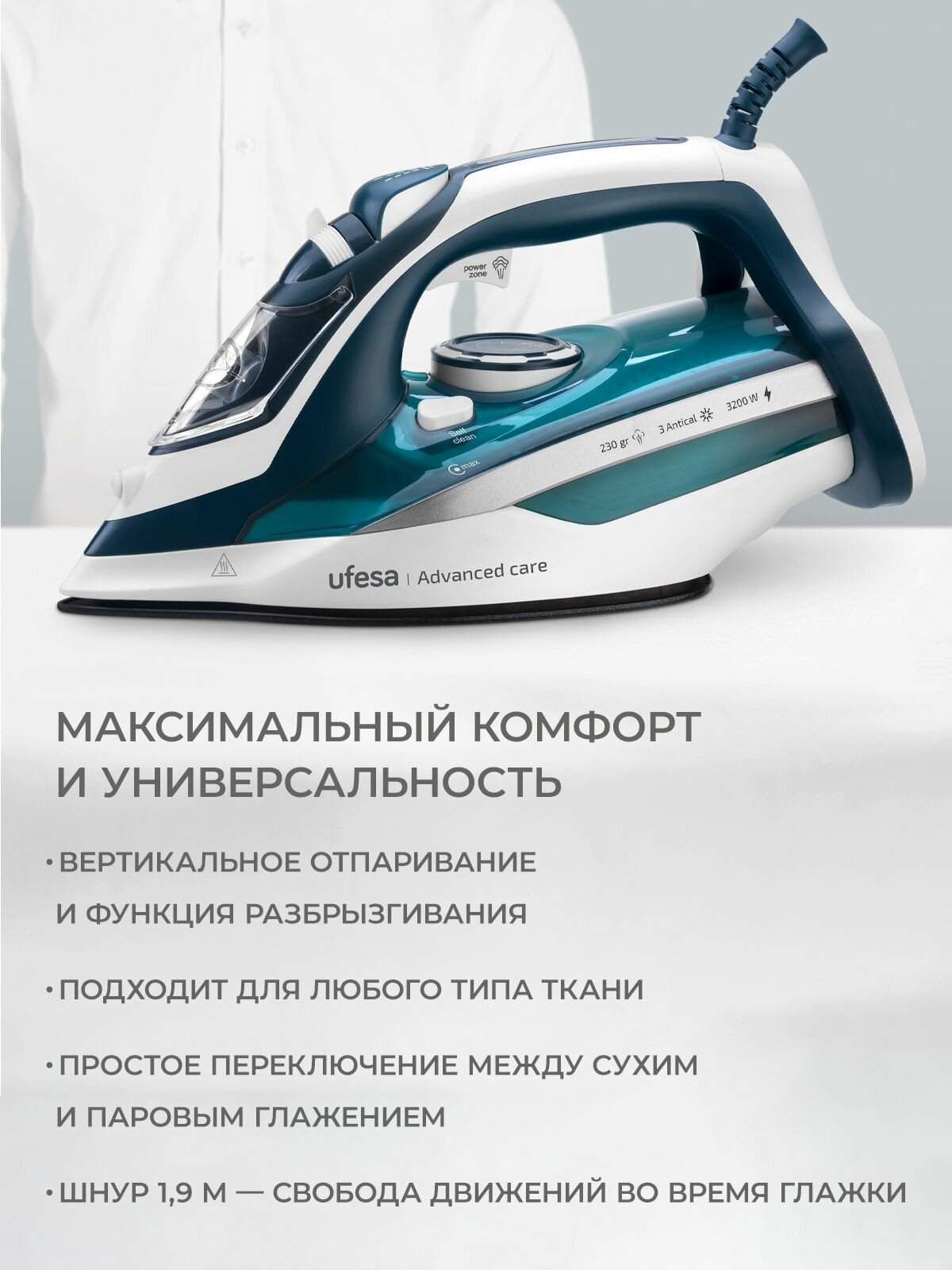 Утюг паровой с антипригарным покрытием UFESA ADVANCE CARE, вертикальное отпаривание, 3200Вт, паровой удар 230 г/мин.: сравнение цен, характеристики, фото, актуальное наличие и цены.