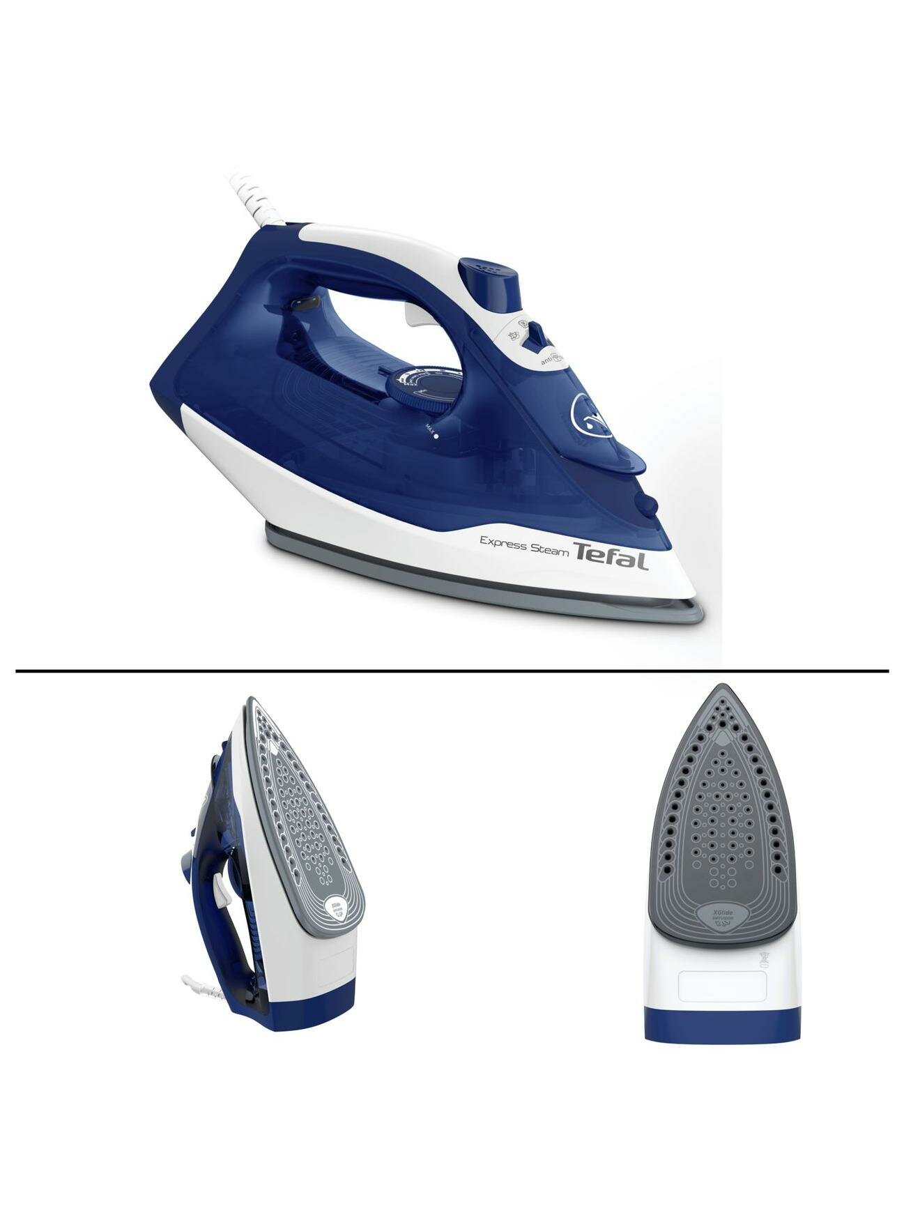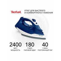 Утюг паровой Tefal Express Steam FV2838E0. Утюг Express Steam создан для быстрого и комфортного глажения и показывает долгую и надежную службу. Благодаря мощности 2400 Вт утюг создает паровой удар 180 г/мин и помогает справиться со стойкими складками в два счета. Утюг оснащен гладкой керамической подошвой и большим резервуаром для воды, которые гарантируют комфортное использование каждый раз. Постоянный пар до 40 г/ мин для быстрого и эффективного ухода за одеждой и безупречного результата. Резервуар для воды объемом 270 мл имеет широкое отверстие для комфортного наполнения. Подошва выполнена в особом дизайне: керамическое покрытие и мягкие края гарантируют легкое и плавное скольжение. Система «Капля-стоп» предотвращает образование грязных пятен на тканях, сохраняя вещи чистыми во время глажения.