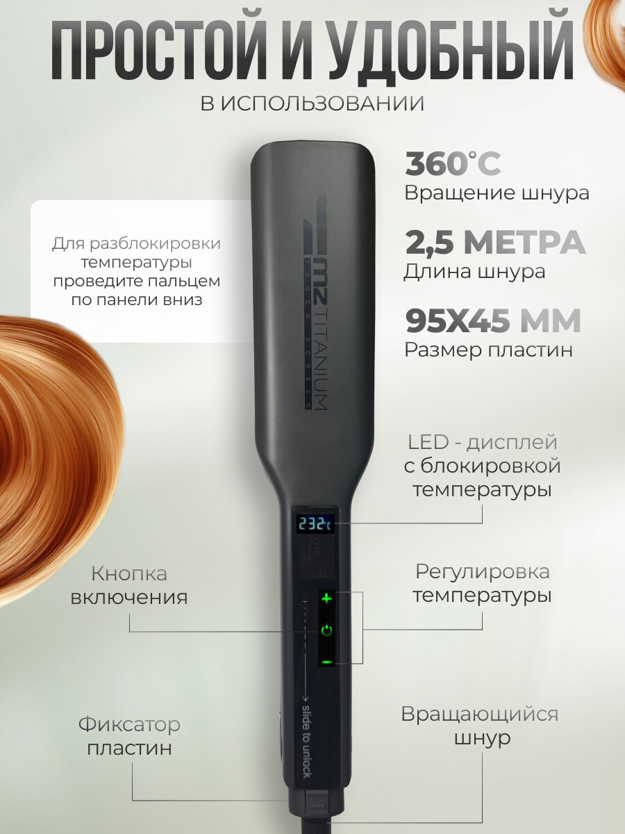 Идеальный утюжок для процедуры кератинового выпрямления, ботокса и нанопластики волос. Титановые плавающие пластины, не цепляющие волос. Разогрев пластин до 10 сек. Поворотный шнур 360С. Сенсорное управление. Индикатор заданной температуры. Индикатор готовности к работеТехнические характеристики MZ Titanium: Мощность: 40 - 70 ВтНапряжение: 100 - 240 ВРазмер пластин: 45 на 95 ммТемпературный диапазон: 50 - 232°С (122 - 450°F)Температурный шаг: 5°С (9°F)Гарантия 6 месяцев с момента покупки. Условия и подробная информация по гарантийным случаям описана в гарантийном талоне. При получении товара рекомендуем ознакомиться с гарантийным талоном.