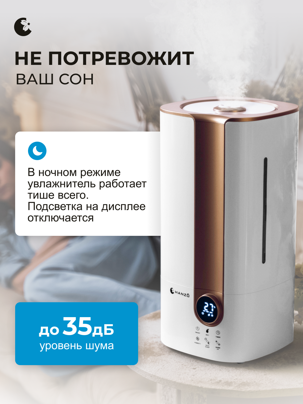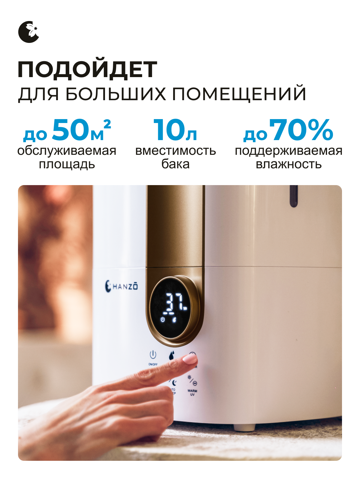 HANZO Z4 — стильный увлажнитель с производительностью до 470 мл/ч и функцией теплого пара. Он быстро достигнет оптимального уровня влажности в вашем доме. Вместительный бак на 10 литров достаточно пополнять всего раз в день. Вода проходит очистку с помощью UV-лампы. Также есть функция теплого пара.