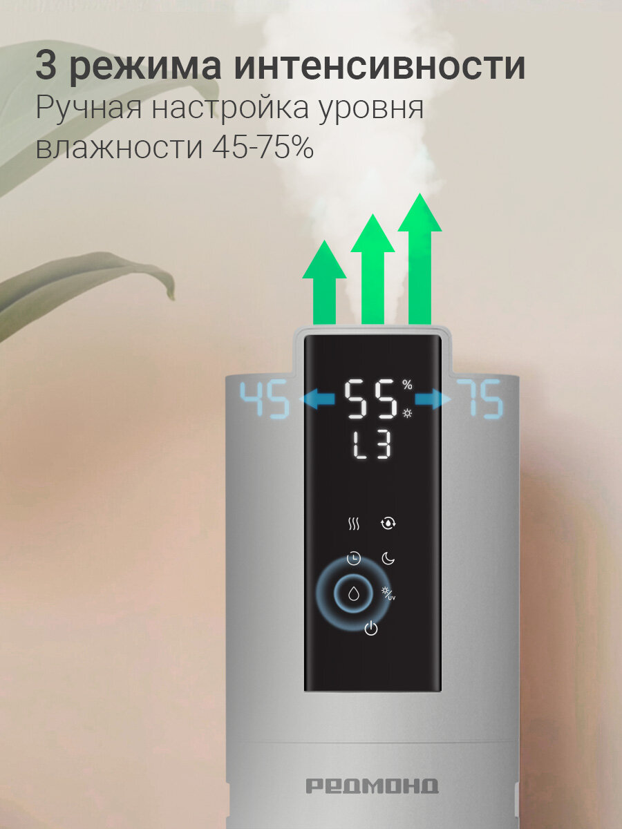 Умный увлажнитель воздуха редмонд HF2213S обеспечивает эффективное быстрое увлажнение — производительность 430 мл/ч позволяет поддерживать комфорт в помещениях до 40 кв. м. Благодаря резервуару на 9 л он работает до 72 часов, а 3 режима интенсивности и ручная настройка влажности дают полную свободу выбора параметров для вашего дома. Функция «Теплый пар» ускоряет увлажнение и способствует удалению бактерий, а встроенная УФ-лампа дополнительно обеззараживает воду. Функция ароматизации позволяет наполнить воздух любимым ароматом. Управление возможно через приложение R4S REDMOND, пульт ДУ или сенсорный дисплей. Таймер, ночной режим (до 35 дБ) и подсветка уровня воды делают использование максимально удобным.