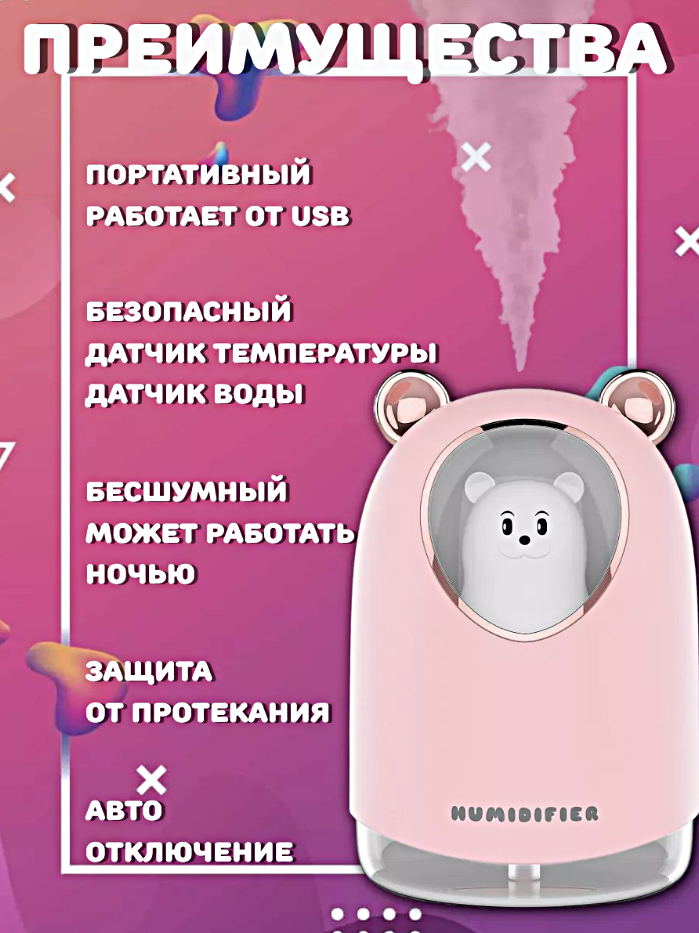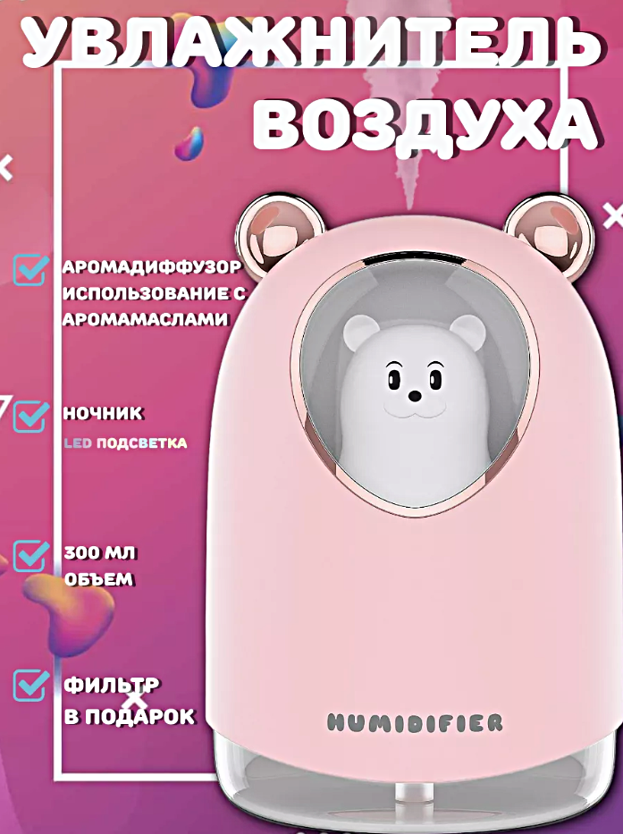 Увлажнитель воздуха с подсветкой Мишка, Ультразвуковой аромадиффузор ночник для дома, Розовый: сравнение цен, характеристики, фото, актуальное наличие и цены.