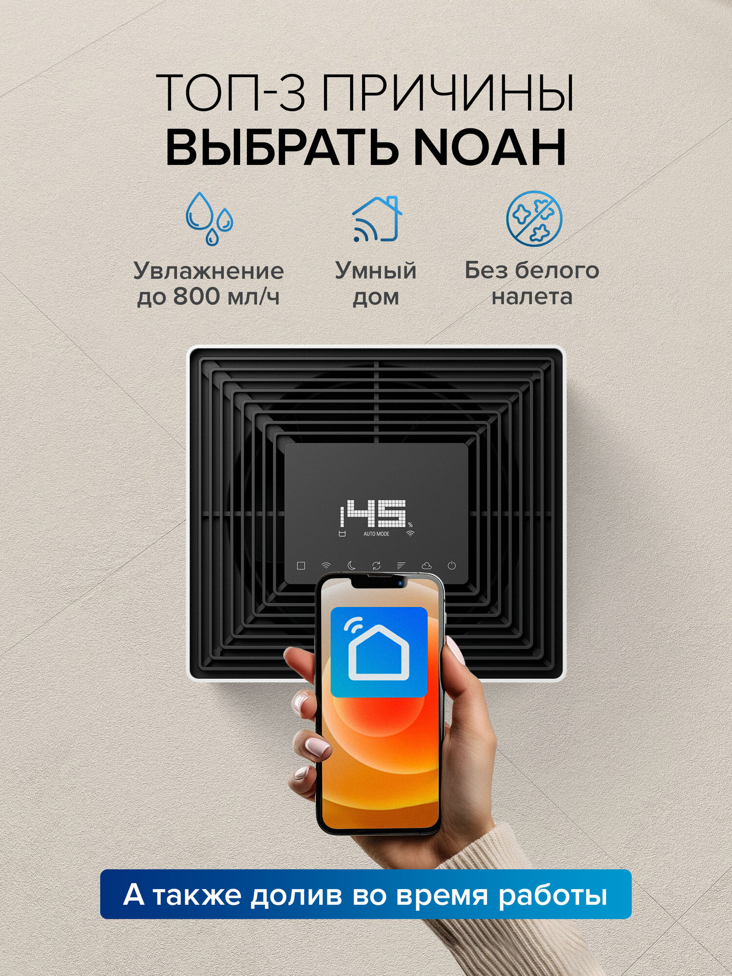 Увлажнитель воздуха Stadler Form "Noah" - это мощное устройство традиционного типа, которое обеспечивает равномерное и естественное увлажнение воздуха в больших и высоких помещениях. С производительностью до 800 мл воды в час, этот увлажнитель воздуха поможет создать комфортные условия для жизни и работы. Устройство оснащено четырьмя уровнями увлажнения и турборежимом, что позволяет быстро повысить влажность при низком энергопотреблении. Встроенный ароматизатор позволяет распространять ваш любимый аромат по всей комнате. Управление устройством осуществляется через приложение, что позволяет контролировать и управлять всеми функциями устройства. Текущая влажность и уровень воды могут отслеживаться на ходу и из любого места. Резервуар для воды легко наполняется через боковую крышку на магнитном замке, а автоматическая подсветка позволяет контролировать уровень воды. Кроме того, резервуар можно наполнять водой непосредственно из-под крана. Для тихих и темных ночей устройство может работать на минимальном уровне мощности, что делает его идеальным для спокойного сна. В комплект поставки входят 2 увлажняющих фильтра с антибактериальной й пропиткой Silvadur и 1 упаковка гигиенических таблеток Hygiene Tabs, поэтому вы можете начать использовать устройство сразу после распаковки. Также отдельно можно приобрести следующие аксессуары для Noah Pro: - Средство для удаления накипи Cleaner & Descaler (Durgol, Швейцария) - Натуральные эфирные масла из коллекции Stadler Form или других производителей Увлажнитель воздуха Stadler Form "Noah" работает в системе "Умный дом" и совместим с экосистемами Smart Life и Stadler Form, что позволяет управлять устройством с помощью смартфона. Увлажнитель "Noah" удостоен награды German Design Award 2026