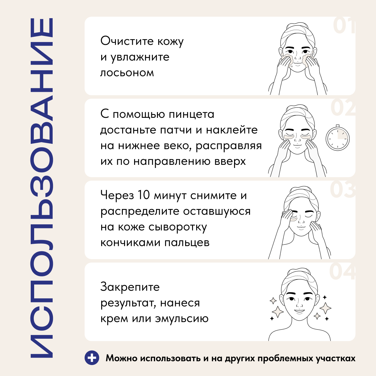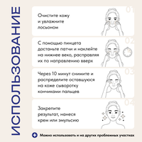 | Способ применения | патчи накладываются на очищенную кожу, на 10-15 минут, вокруг области глаз или рта. После снятия оставшийся на коже раствор не смывать. |