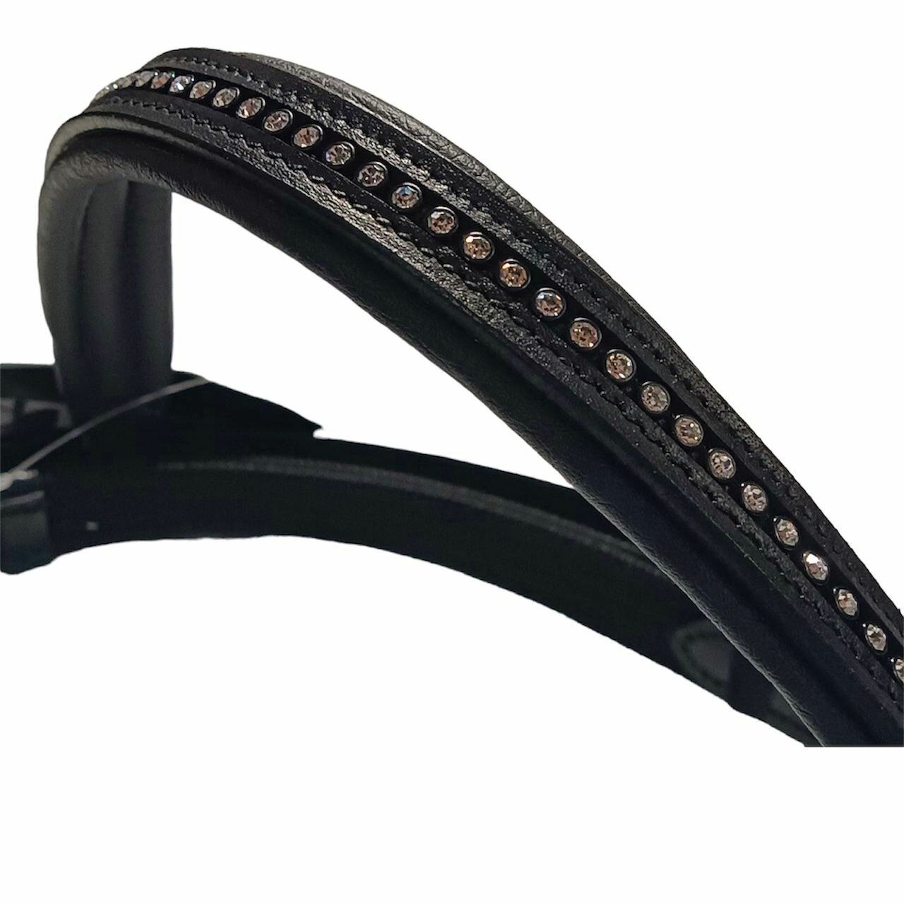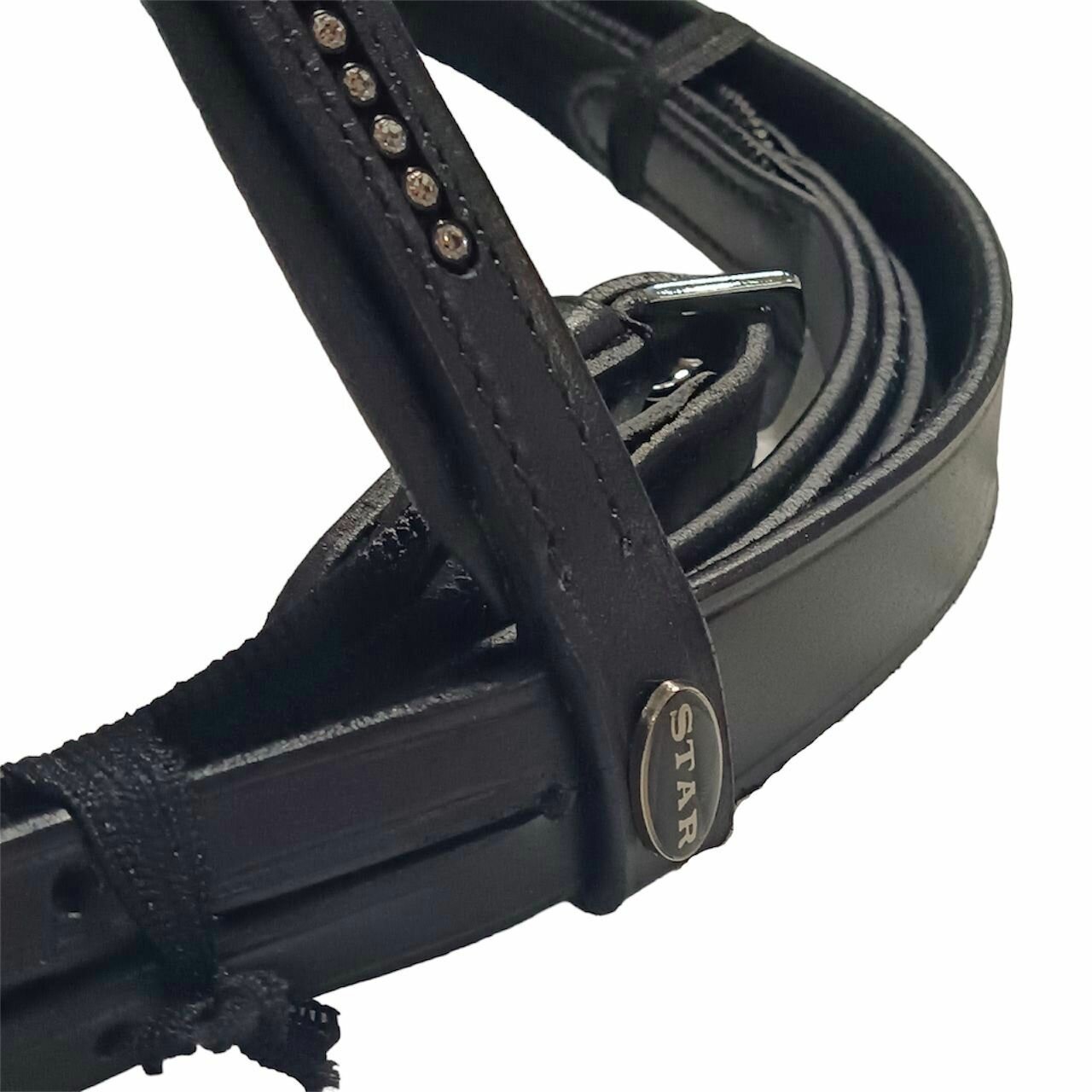 Коллекцию уздечек STAR отличает превосходное соотношение цена/качество Уздечка из надежной износостойкой кожи Налобник со стразами Комбинированный капсуль Мягкая подложка капсуля и налобника Никелированная фурнитура Тесьмяные поводья шириной 19 мм