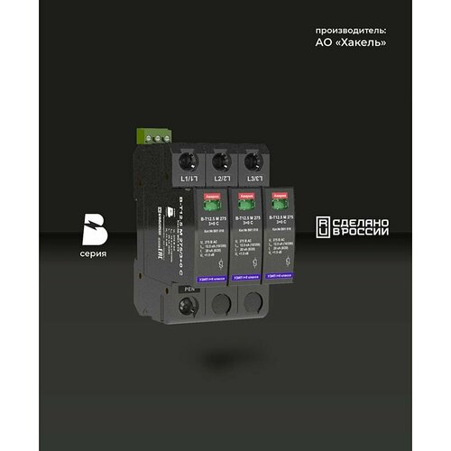 Трехполюсное УЗИП класса испытаний I+II ограничивающего типа серии блиц Т. Применяется для защиты силовых цепей переменного тока при кабельном или воздушном вводе электропитания в сетях с системами заземления типа TN-C. Состоит из трех сменных варисторных модулей и базы для подключения к DIN-рейке 35 мм. Iimp(10/350) = 12.5 кА, Uc = 275 В AC. Устройство серии блиц В-Т12.5 М 275/3+0 С соответствует УЗИП класса испытаний I+II и применяется в низковольтных электрических сетях на границе 0А(В) - 1 зон молниезащиты (в соответствии с «Инструкцией по устройству молниезащиты зданий, сооружений и промышленных коммуникаций» со–153-34.21.122-2003) при кабельном подземном или воздушном вводах электропитания в качестве I+II ступени защиты, в соответствии с: ГОСТ Р 50571-4-44-2011, ГОСТ Р 50571.5.53-2013, ГОСТ IEC 61643-11-2013. В-Т12.5 М 275/3+0 С, ТУ 3428-002-79740390-2007 – трехполюсное УЗИП класса I+II на основе оксидно-цинковых варисторов: • Предназначено для защиты фазных проводников от противофазных (поперечных) перенапряжений в цепях L/PEN в системах переменного тока;• Состоит из трех сменных варисторных модулей и базы для подключения к DIN-рейке 35 мм;• Выпускается на максимальное длительное рабочее напряжение Uc=275 В AC;• Способно отводить импульсы тока Iimp(10/350) = 12.5 кА;• Применяются в сетях с системами заземления типа TN-C; • Для удаленного контроля В-Т12.5 М 275/3+0 С снабжено “сухими” контактами дистанционной сигнализации. Визуальный контроль рабочего состояния УЗИП проводится с помощью индикаторов, расположенных на сменных варисторных модулях. В исправном состоянии индикатор имеет зеленый цвет, в аварийном - красный. Удалённый контроль осуществляется с помощью дистанционной сигнализации - переключением «сухого» безпотенциального контакта.