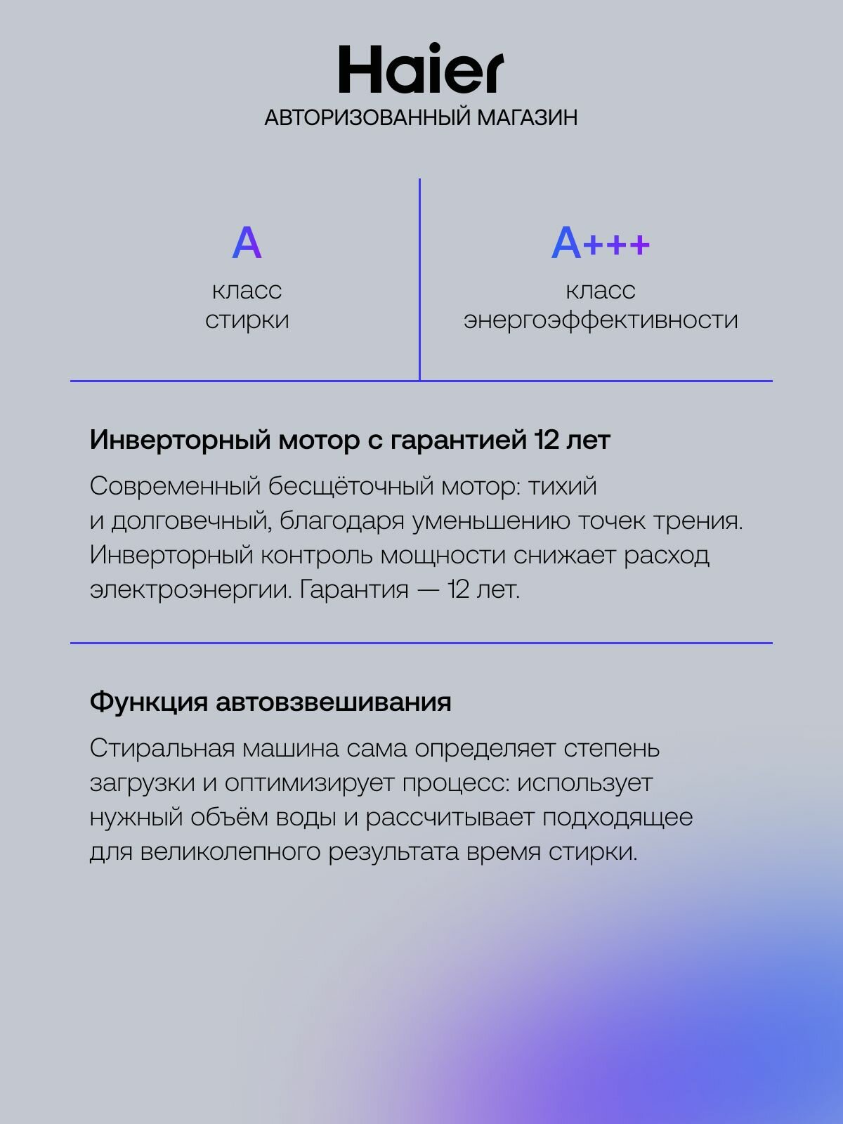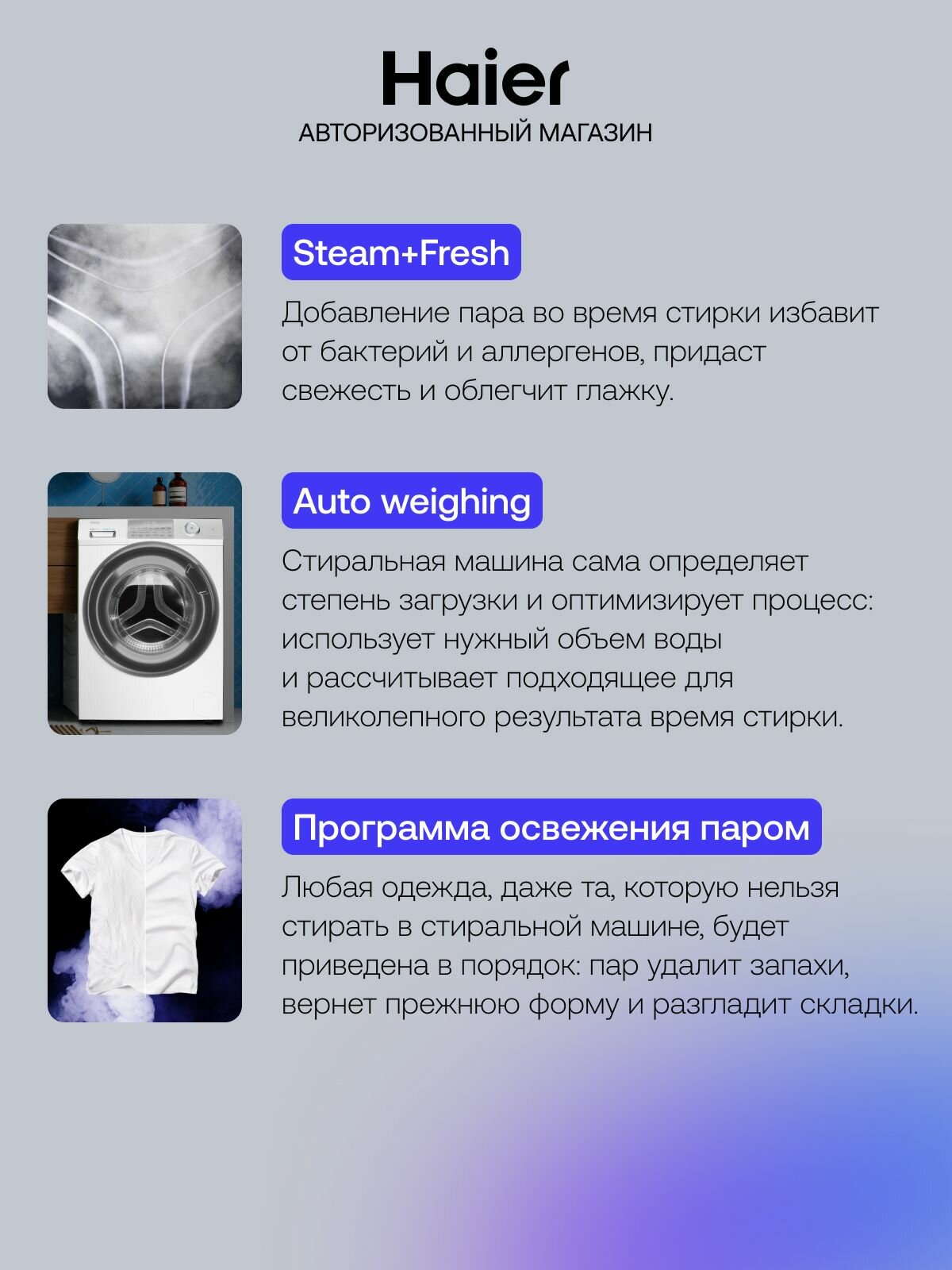 автовзвешивание, автоматическая дозировка моющего средства, выбор скорости отжима, выбор температуры стирки, контроль баланса, контроль за уровнем пены, отложенный старт, очистка барабана, сигнал окончания стирки