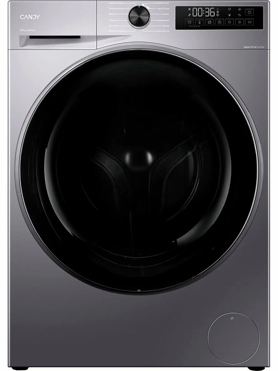 Узкая стиральная машина с сушкой Candy NOVA C43D 485MBBR-07, загрузка 8/5 кг, 12 программ, 1400 об/мин, инверторный мотор, отсрочка старта, серебро