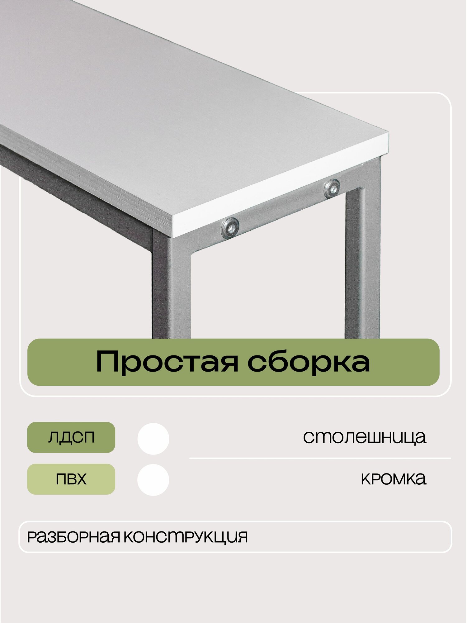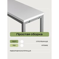 Консольный столик с разборным каркасом размерами 80 см длина, 80 см высота, 20 см глубина. Столешница из ЛДСП белого цвета. Подстолье из квадратной трубы 20х20мм, окрашено долговечной полимерно-порошковой краской в цвет серый металлик. Состоит из 4 частей и за 10 минут собирается болтами. Предусмотрены ргулируемые ножки для выравнивания пола. Консоль выдержит нагрузку 100 кг.