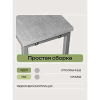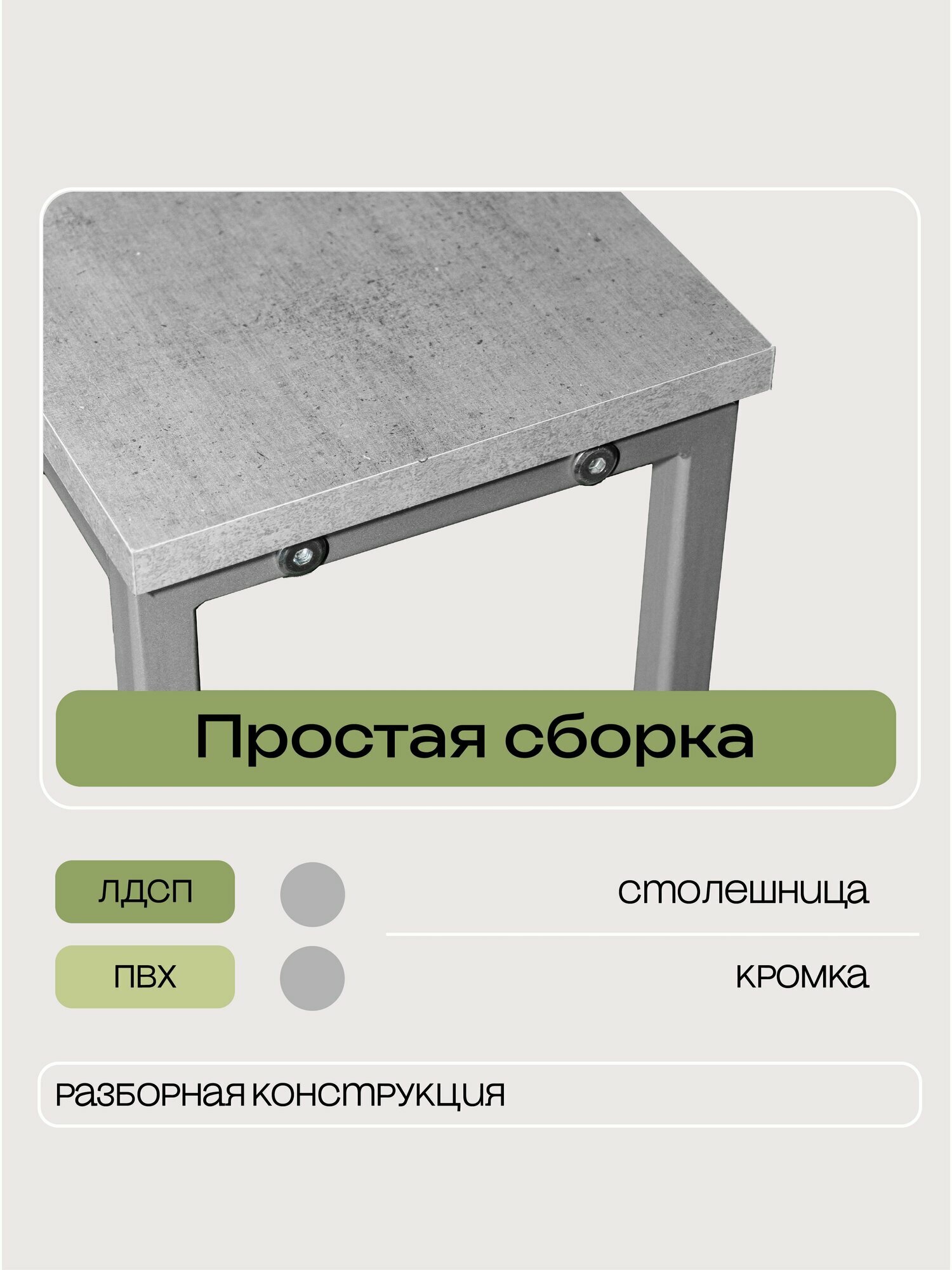 Столешница изготовлена из ЛДСП цвета 'серый бетон' размером 80х20 см — этот материал отличается износостойкостью, простотой в уходе и гармонично сочетается с металлическим каркасом. Современная цветовая гамма 'серый бетон' и 'серый металлик' делает столик универсальным элементом для интерьеров в стиле лофт, минимализм, скандинавский или хай-тек.