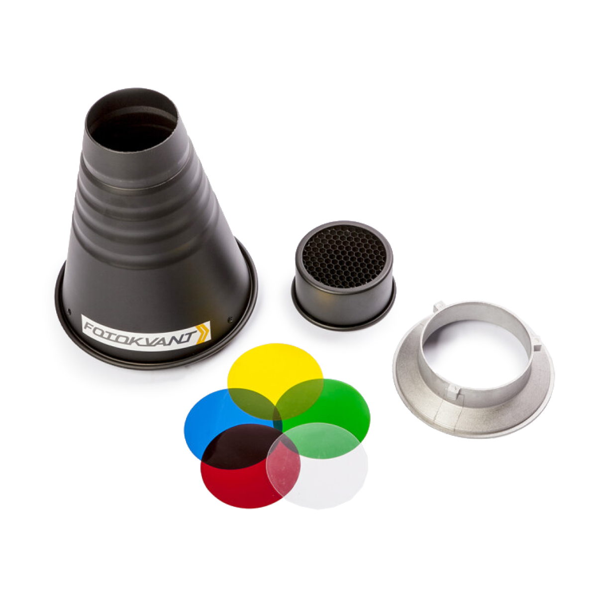 Узкоугольная насадка Fotokvant SNOOT-22-BW с комплектом цветных фильтров. Длина насадки - 22 см. Байонет - Bowens. Применяется для получения различных световых эффектов в творческой фотографии. Узкая носовая часть диаметром 5,8 см, широкая - 11,6 см. Длина насадки – 22 см. В комплекте пять цветных фильтров (прозрачный, синий, красный, зеленый, желтый) и сотовая насадка.